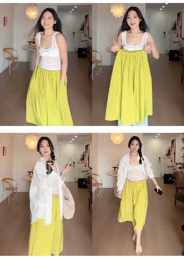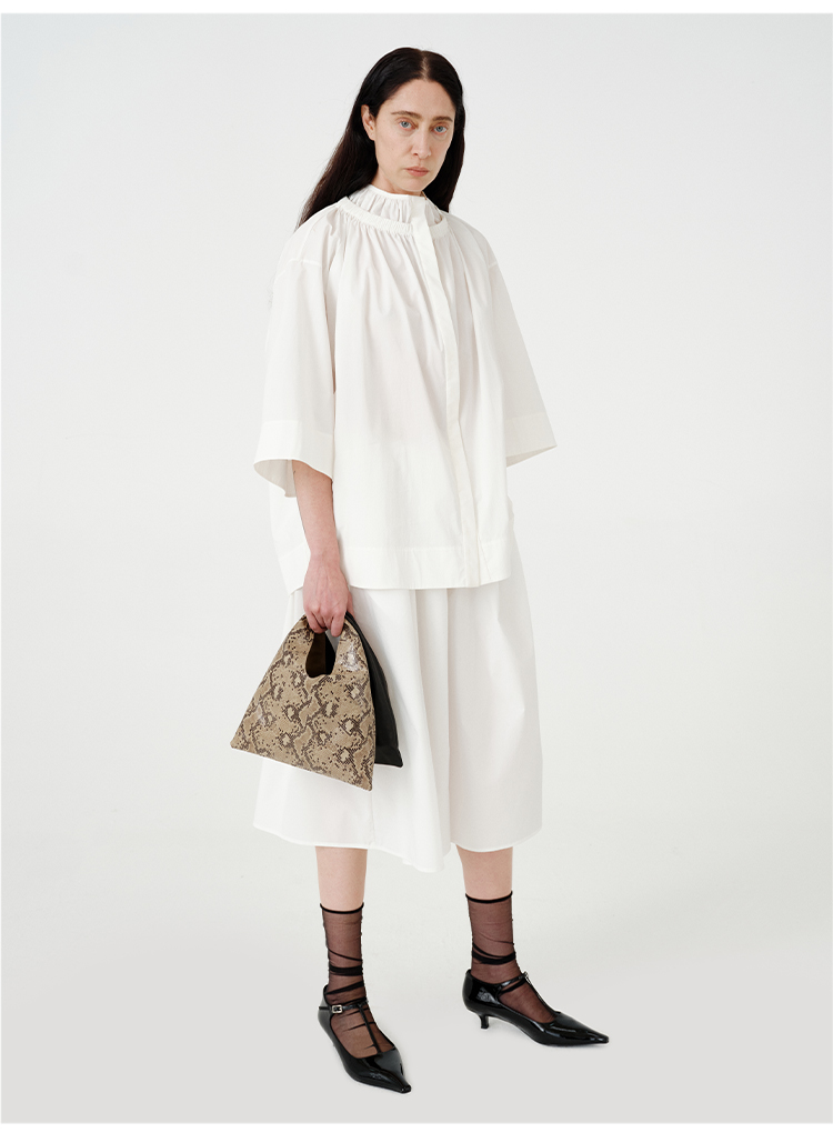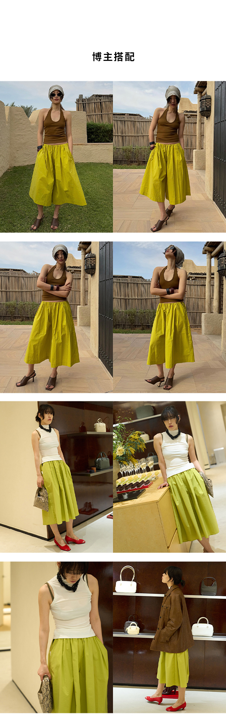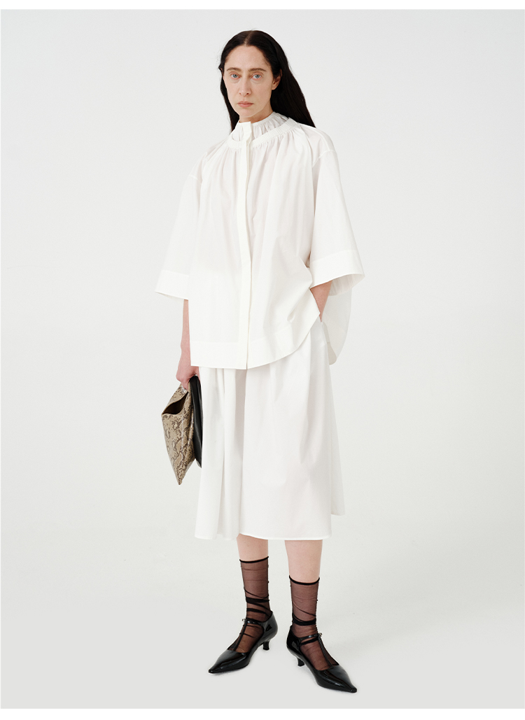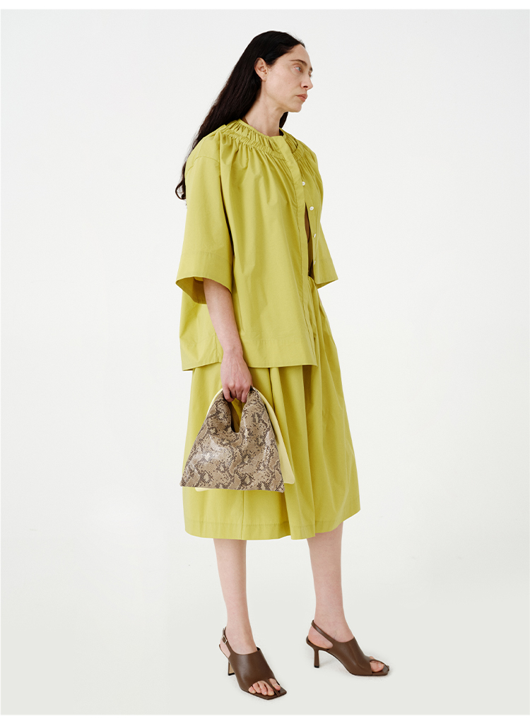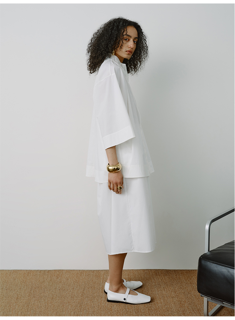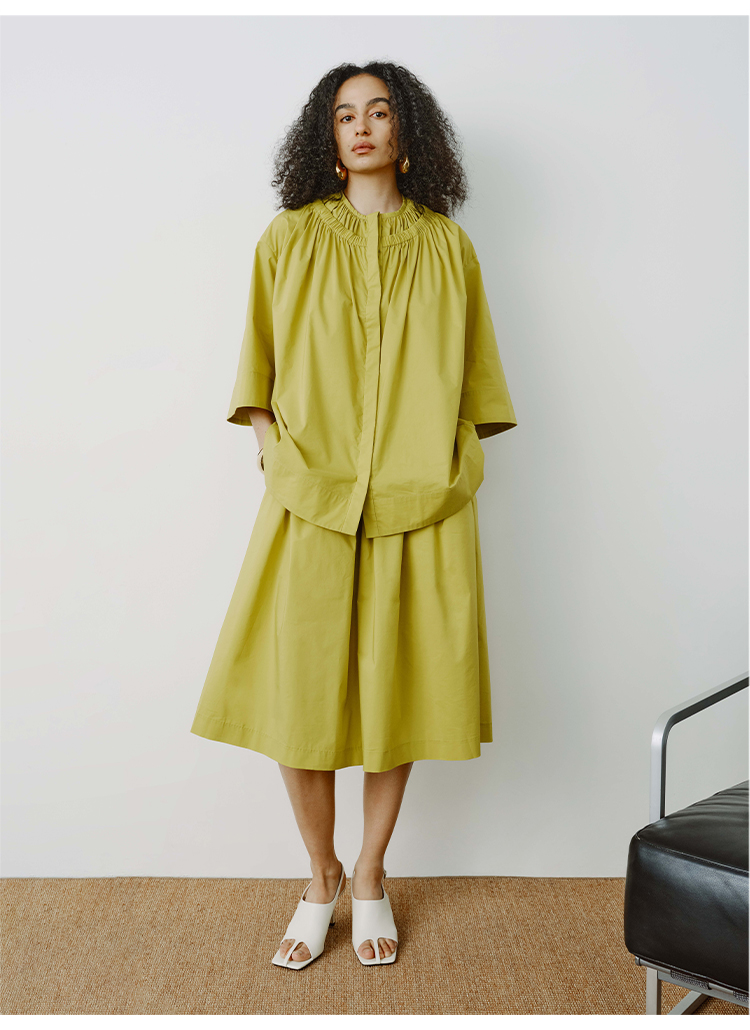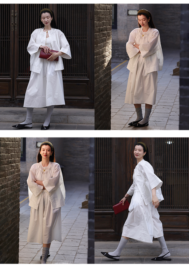 HIDEMI【当当同款】 浅春系甄选长绒棉极简设计感花苞压褶圆领廓形衬衫裙裤套装 白色/有机青柠绿 衬衫/裙裤