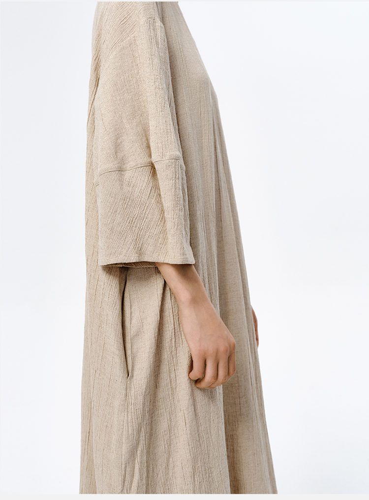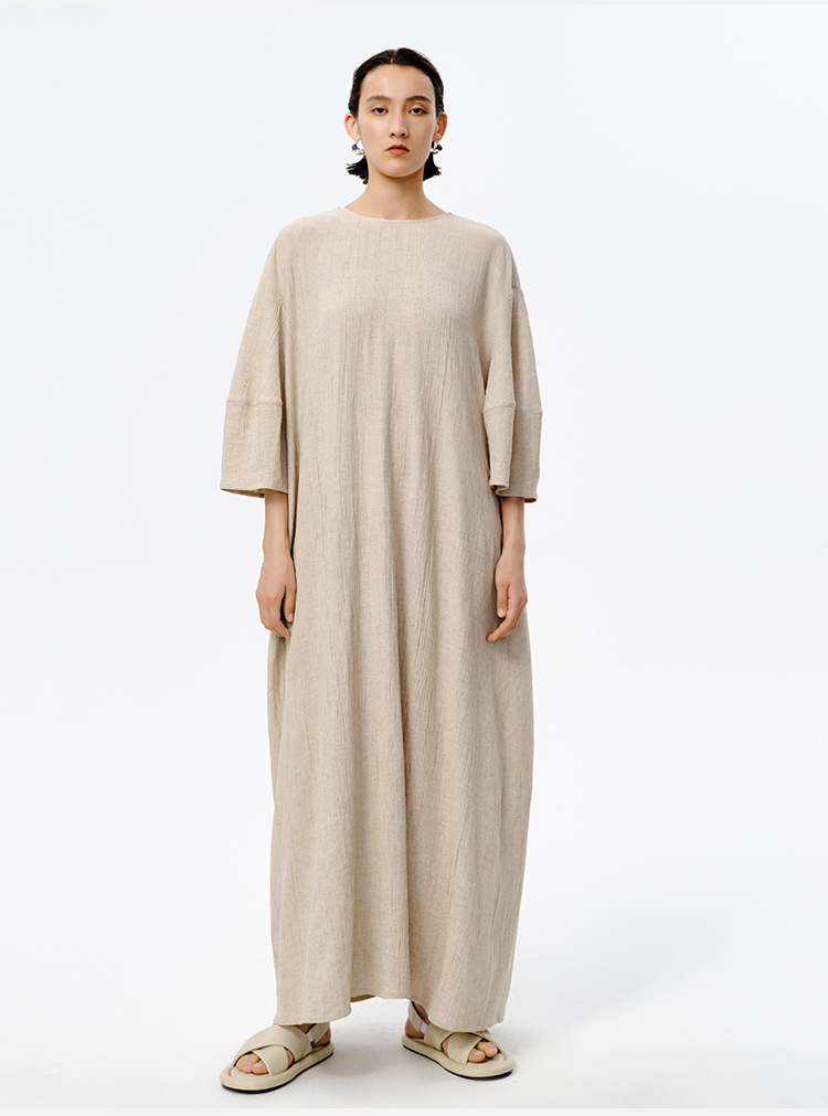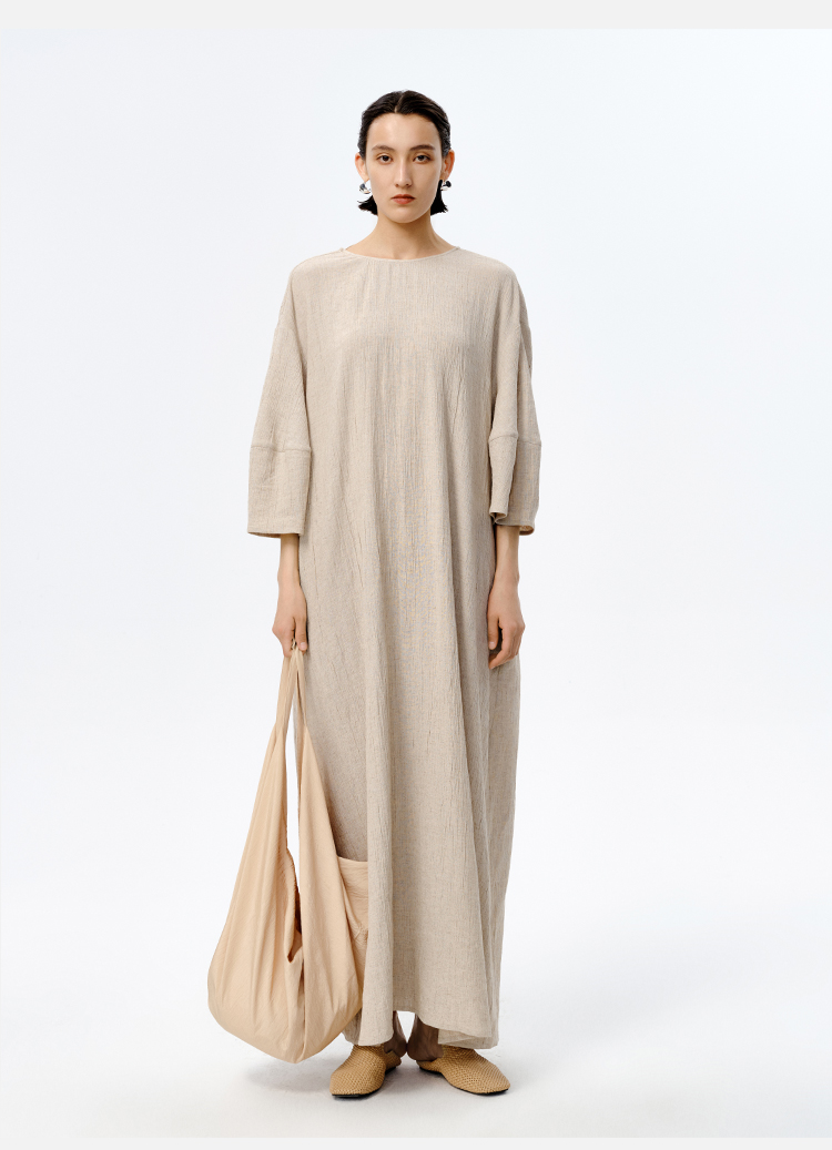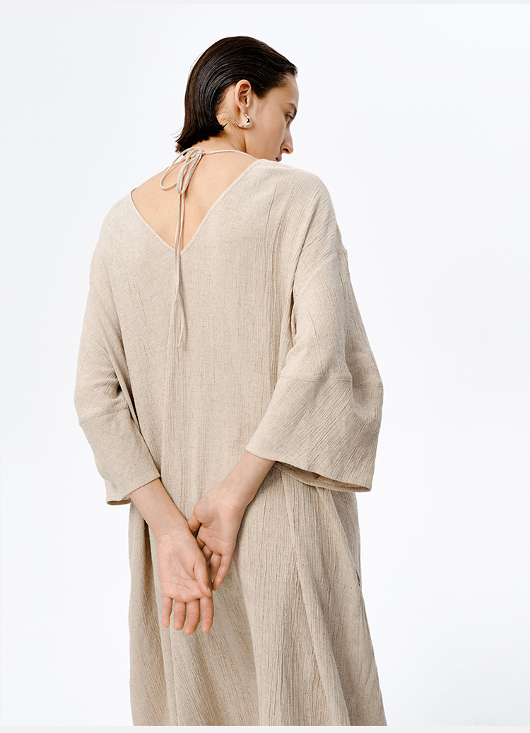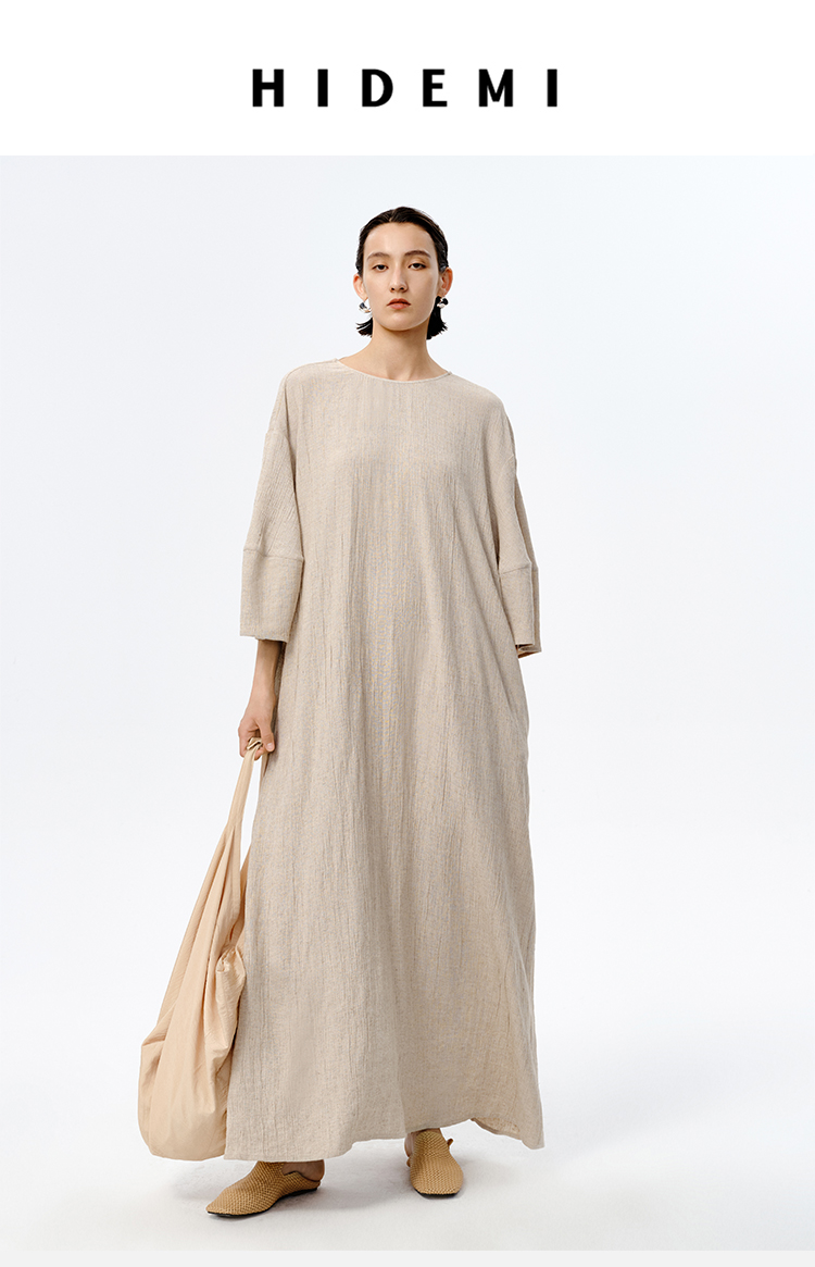 HIDEMI 艺术肌理感燕麦亚麻大廓形系带慵懒连衣裙