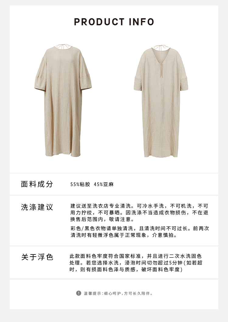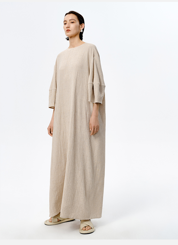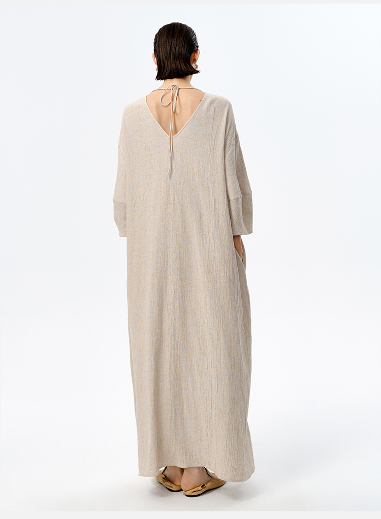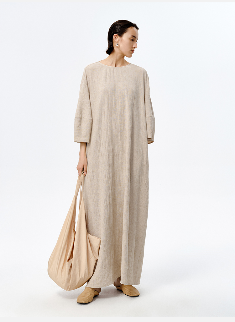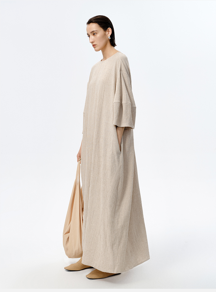HIDEMI 艺术肌理感燕麦亚麻大廓形系带慵懒连衣裙