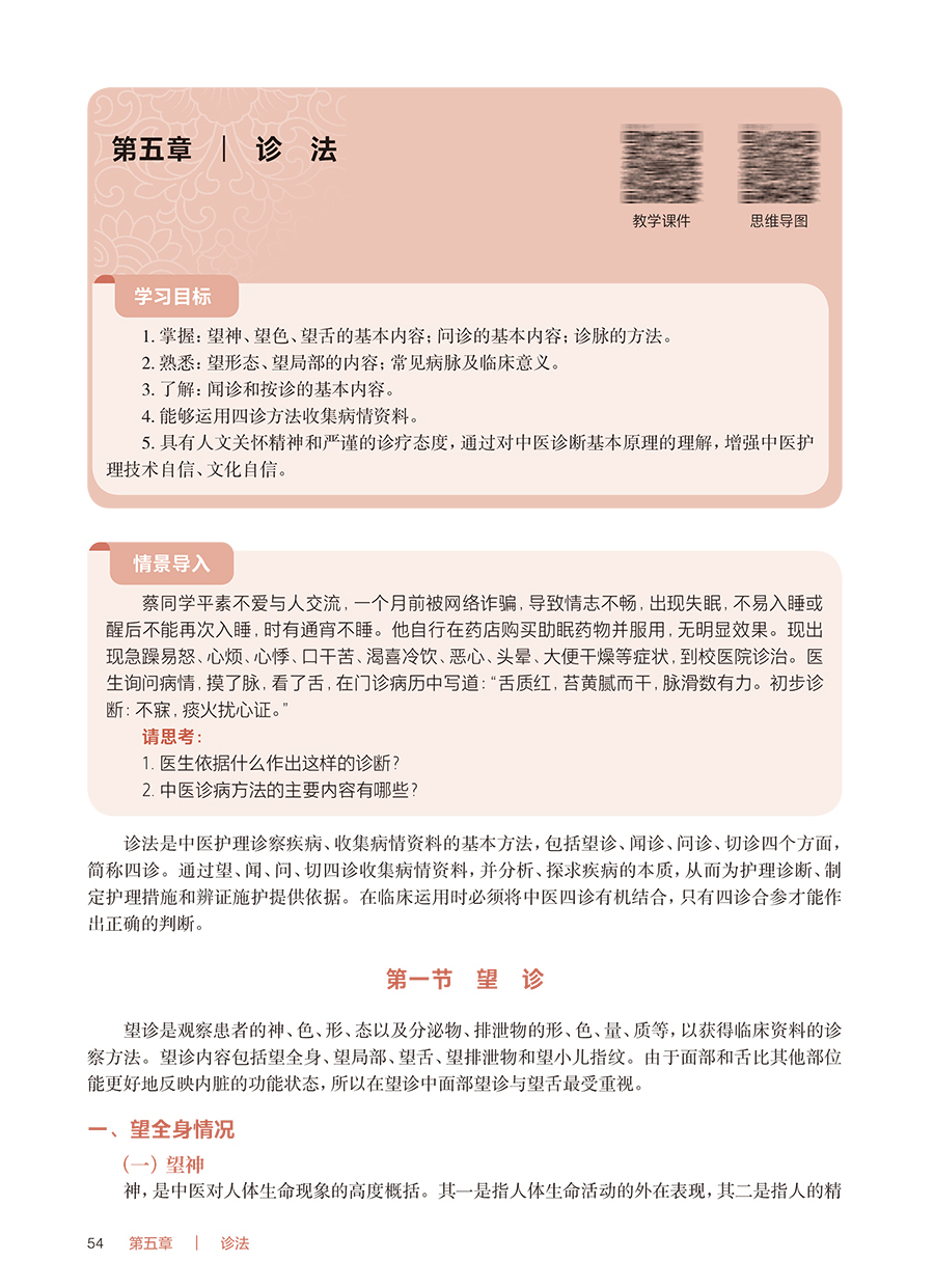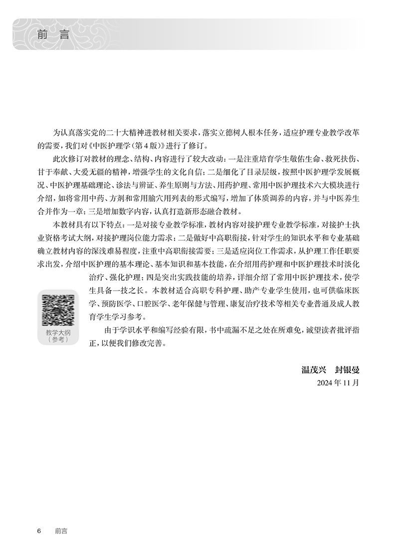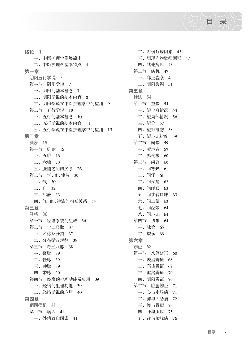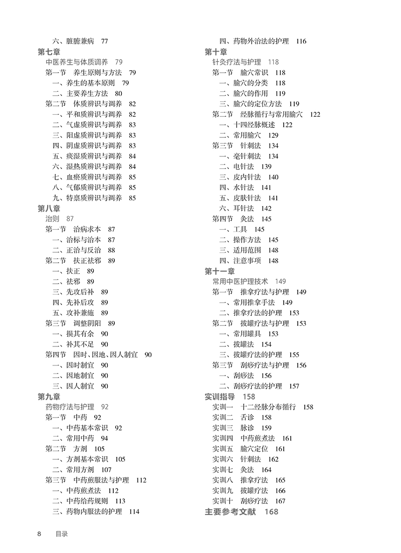 此为国家卫生健康委员会“十四五”高等职业教育专科护理类专业规划教材之一。本教材分为中医基础理论、诊法与辨证、体质辨识与养生护理、用药护理、常用中医护理技术五大模块。根据培养目标确定内容的深浅难易和文字的详略。理论知识体现“必需、够用”,为学生上岗后开展中医养生护理、用药护理、专科技术护理提供理论支撑,满足学生护士执业资格考试的需要。针灸推拿等护理技术部分体现实用性,重点介绍各种护理技术操作方法,让学生能够学到一技之长。具体内容包括绪论中医护理学发展简史及基本特点,第一章阴阳五行学说,第二章藏象,第三章经络,第四章病因病机,第五章诊法,第六章辨证,第七章体质辨识与养生,第八章治则,第九章药物疗法与护理,第十章针灸疗法与护理,第十一章常用中医护理技术。