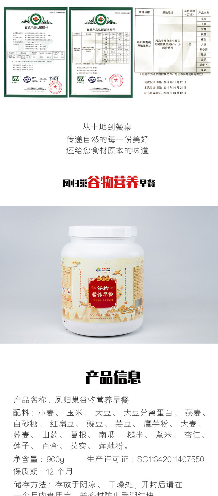 凤归巢谷物营养早餐:富含蛋白质和多种谷类纤维,采用先进的分离提取技术精致而成,无添加香精、化工合成色素、防腐剂、化工合成甜味剂、奶精等化学添加剂,采用非转基因谷物作为原料,健康安全,老少皆宜。