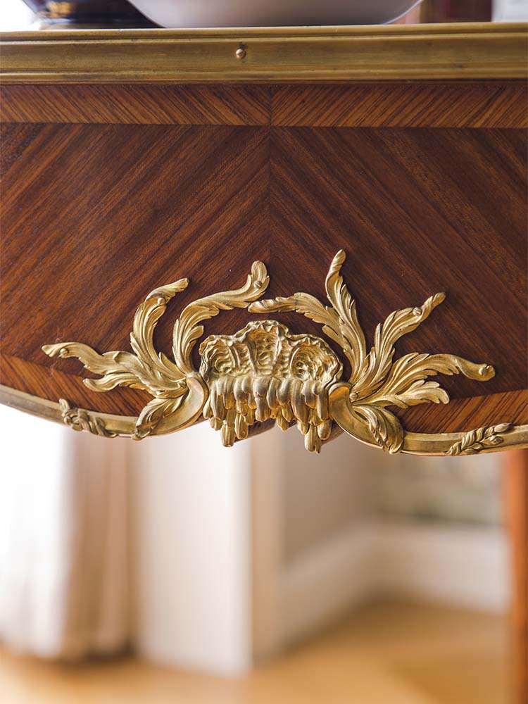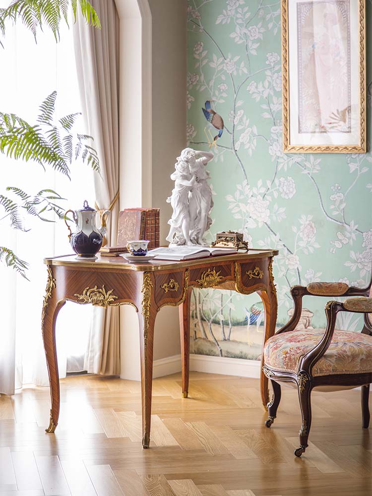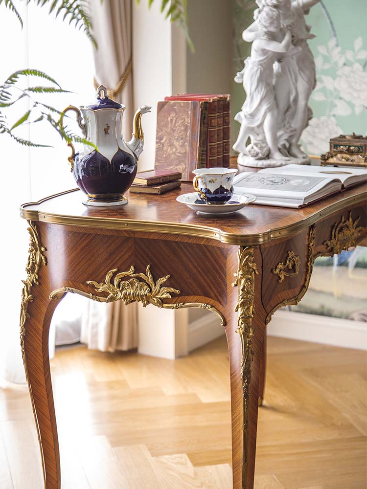 独角鹿西洋古董法国林克家具工坊签名出品路易十五风格花卉主题铜鎏金精雕细木镶嵌边桌古董家具