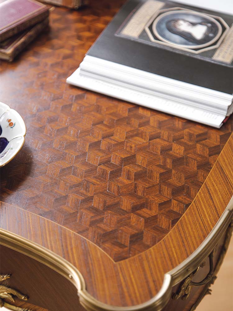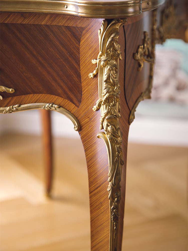 1890年代法国林克家具工坊签名出品路易十五风格花卉主题铜鎏金精雕装饰菱格纹细木镶嵌边桌