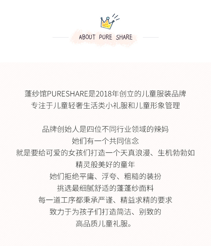 PureShare蓬纱馆,2018年创立的儿童服装品牌,专注于儿童轻奢生活类小礼服,主张“让孩子做最独特的自己”的品牌理念,为孩子们提供时尚简洁、优雅而又不失童真的生活类礼服。
