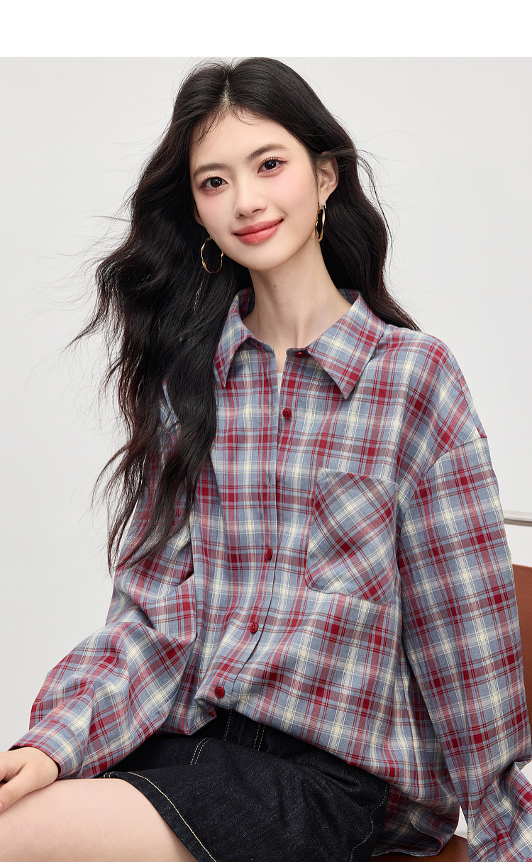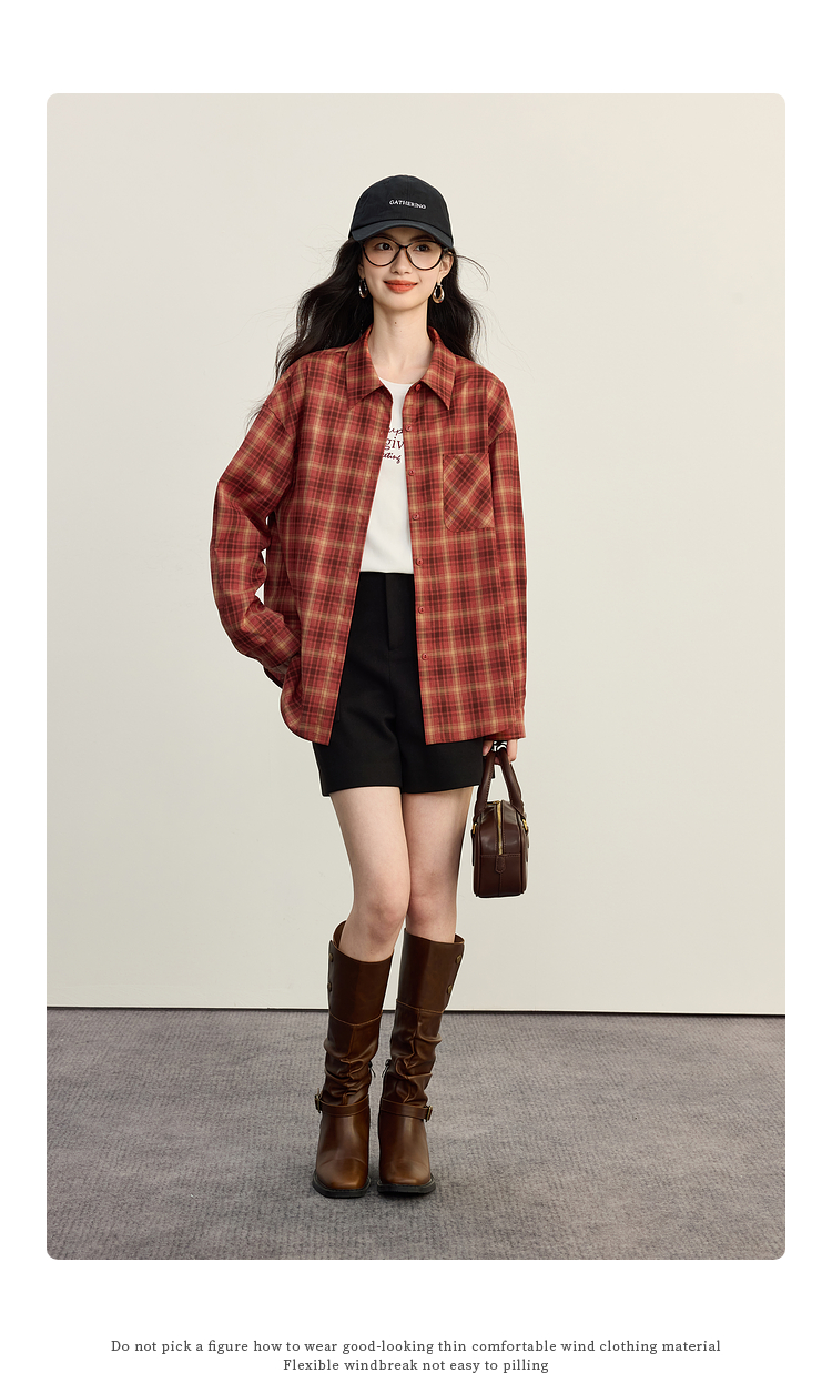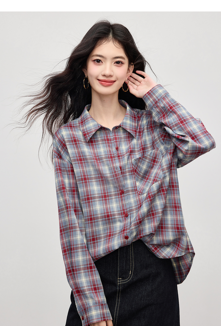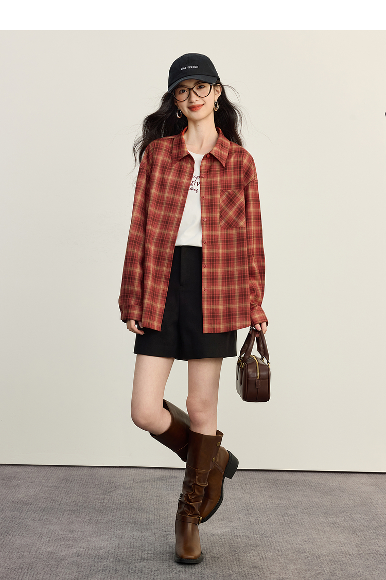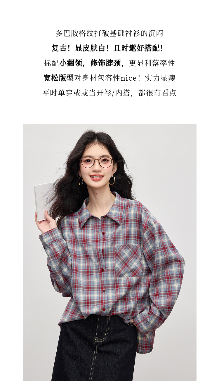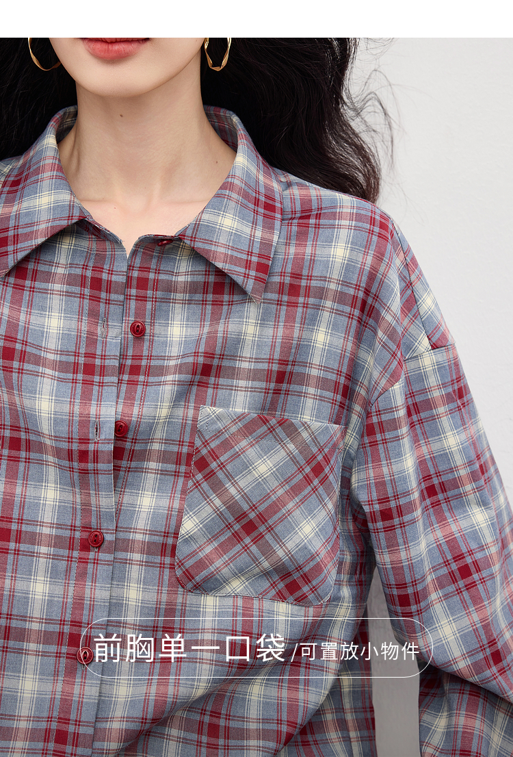 【周末秒杀】熙世界BF风复古格纹衬衫女宽松慵懒百搭时尚休闲衬衣2025秋季新款