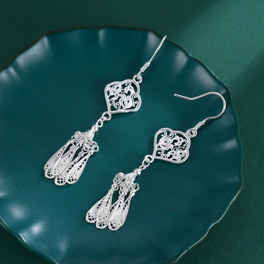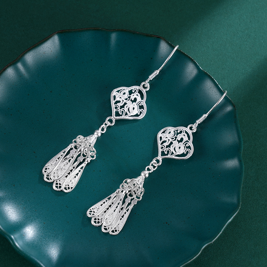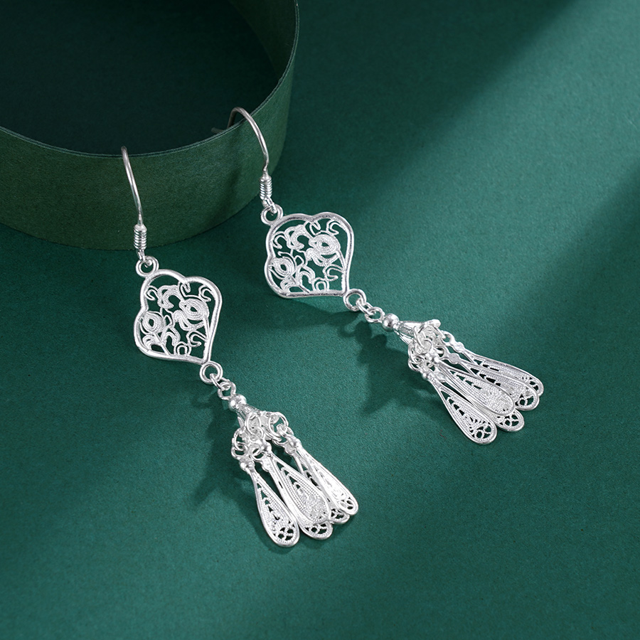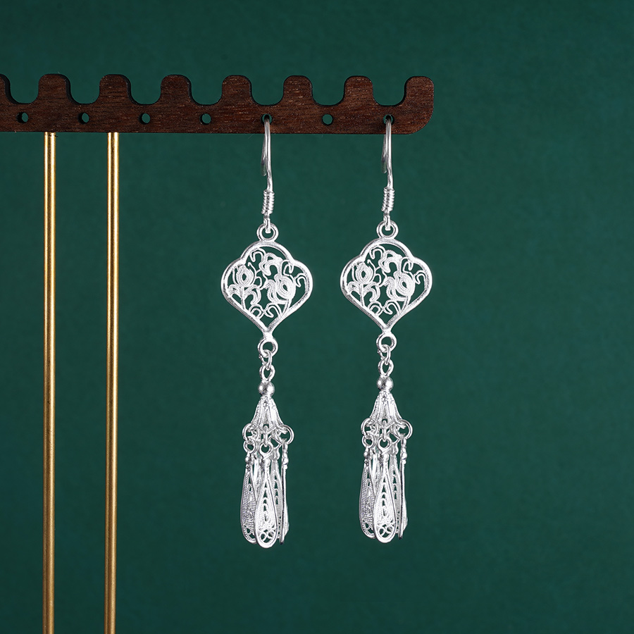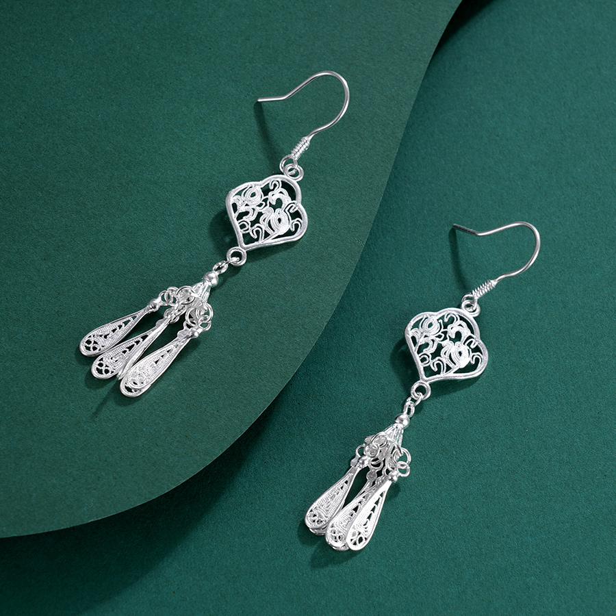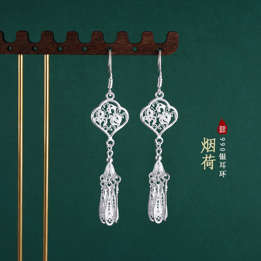 【寓意】:耳环以“荷花”为灵感,采用银花丝工艺打造,独特的流苏设计,展现清雅脱俗的韵味。寓意荷荷美美,好事莲莲。