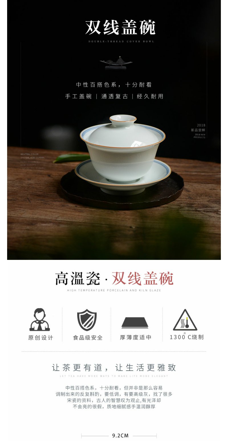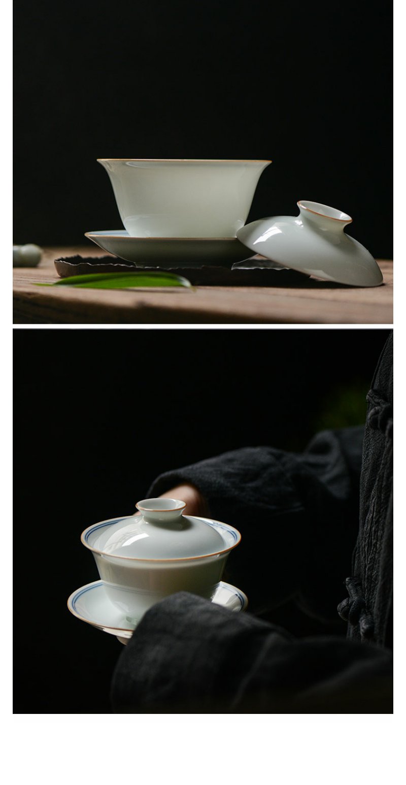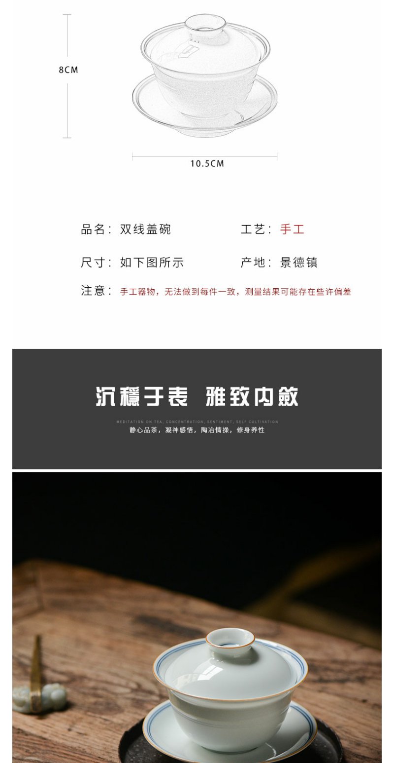 抱翁堂 青白釉双线盖碗 120ml 口径9.3cm 高8.2cm 景德镇抱翁堂手工经典薄胎单色釉陶瓷双线盖碗
