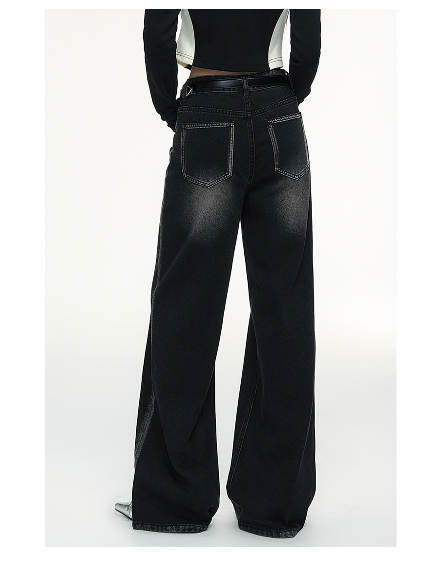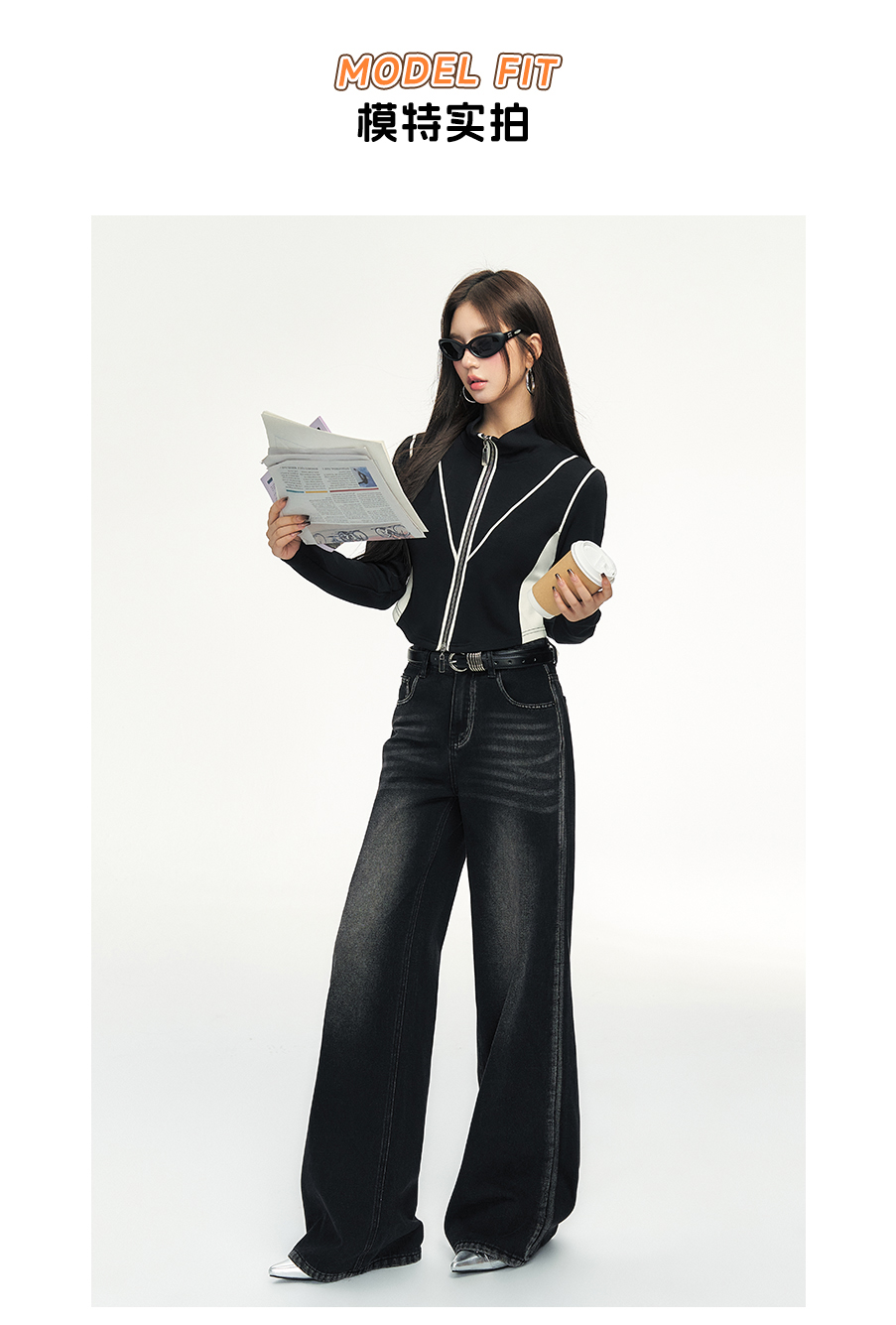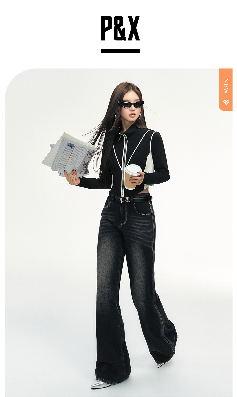 P&X设计师女装 时尚街头水洗牛仔长裤宽松阔腿裤825110051 黑色