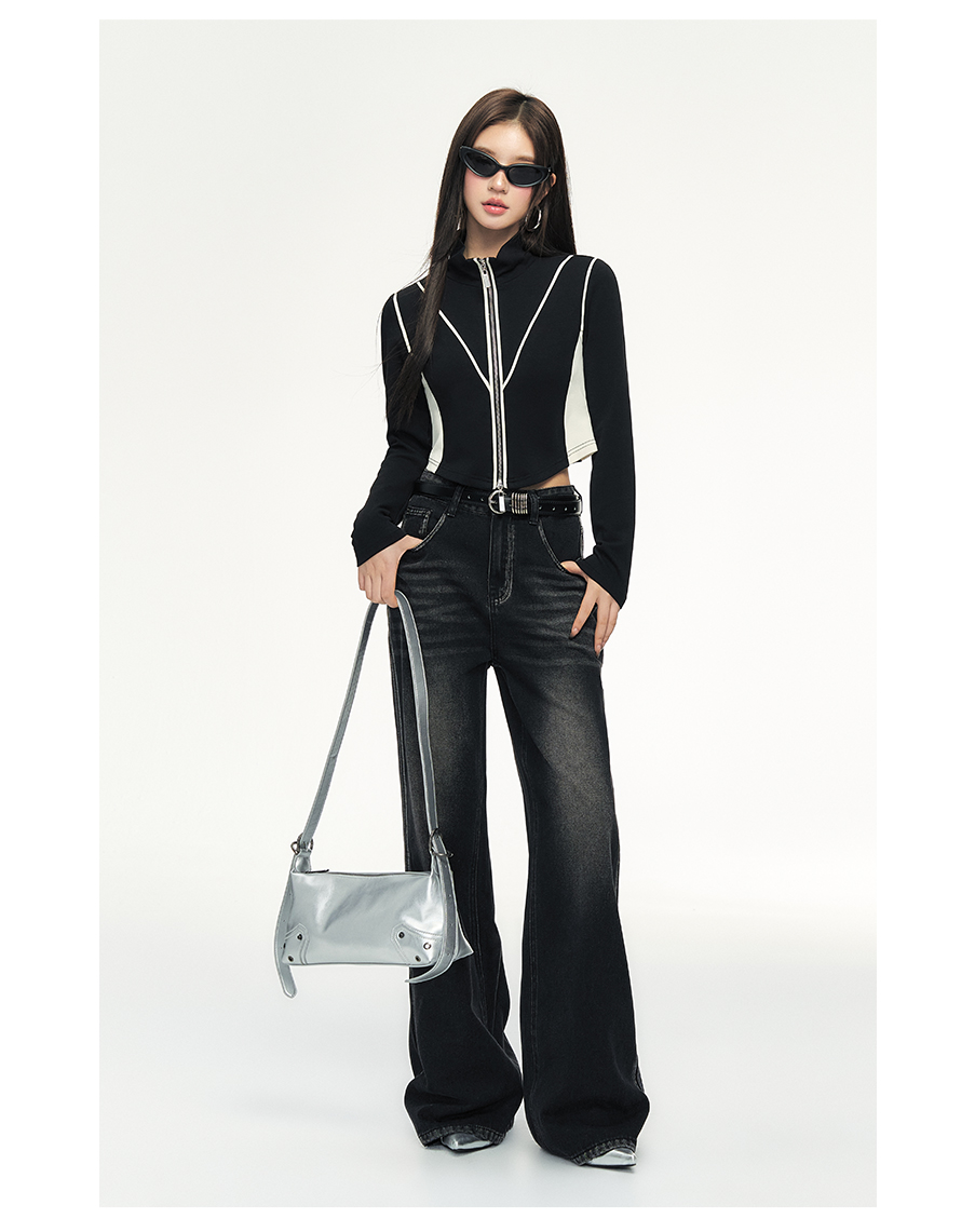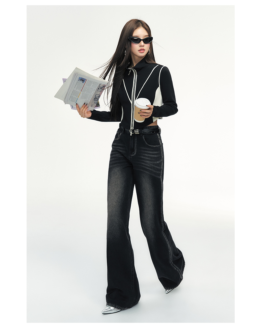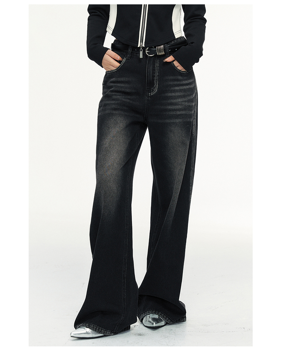 P&X设计师女装 时尚街头水洗牛仔长裤宽松阔腿裤825110051 黑色