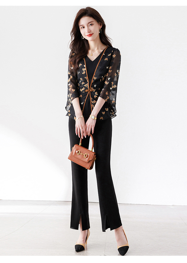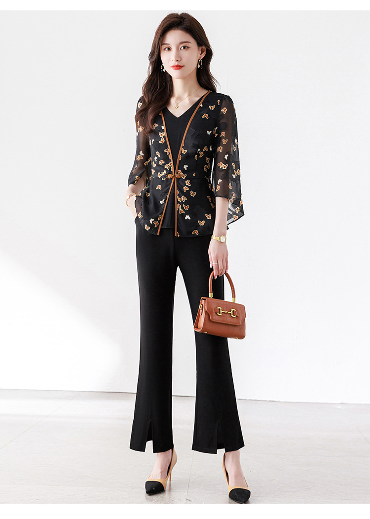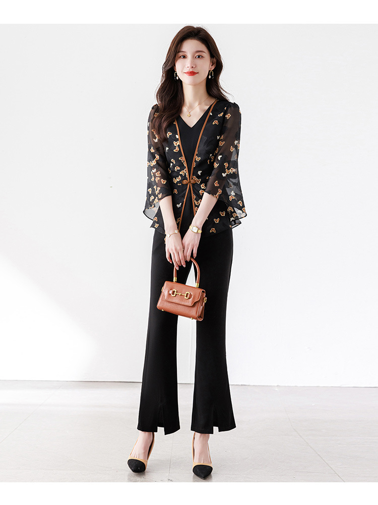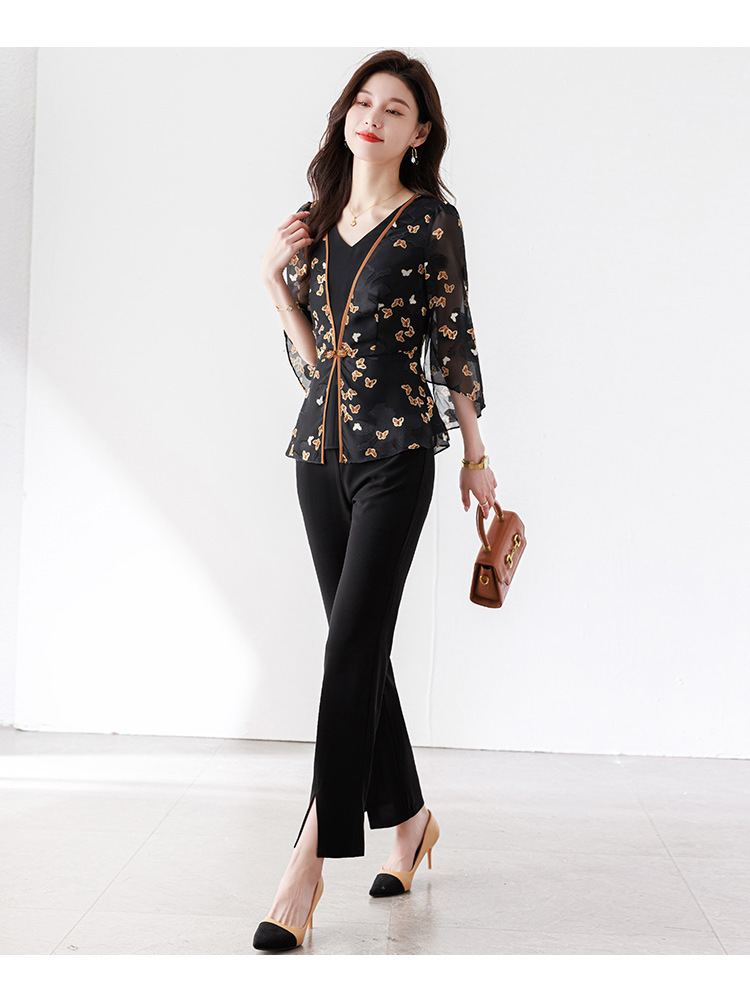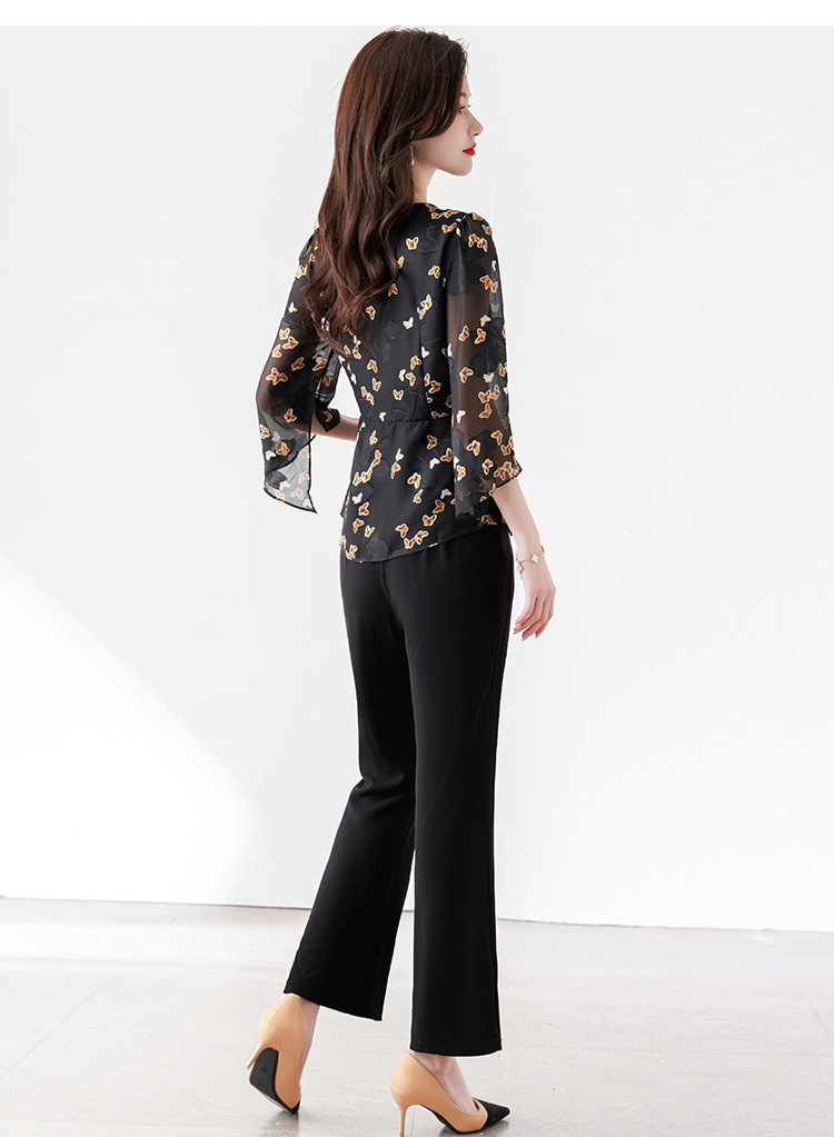 夏季新款,优雅两件套雪纺印花中袖打底衫高腰长款微喇裤套装QYM-TB-CY1029-Y