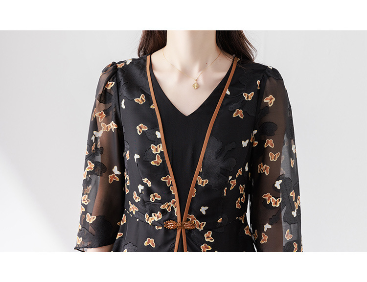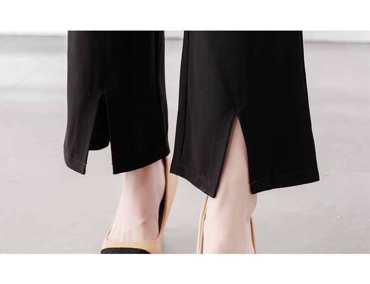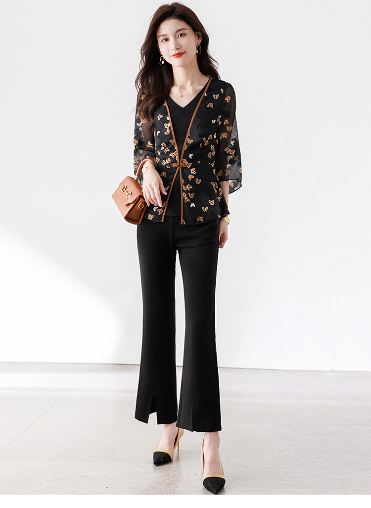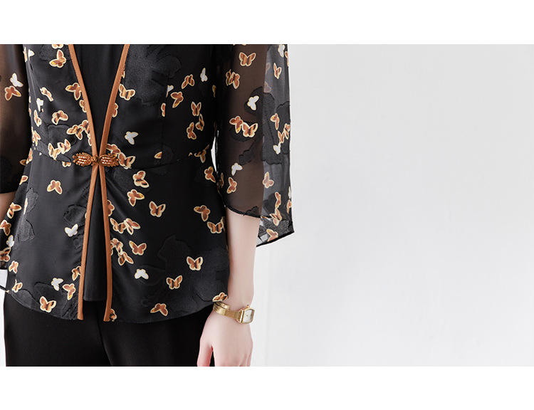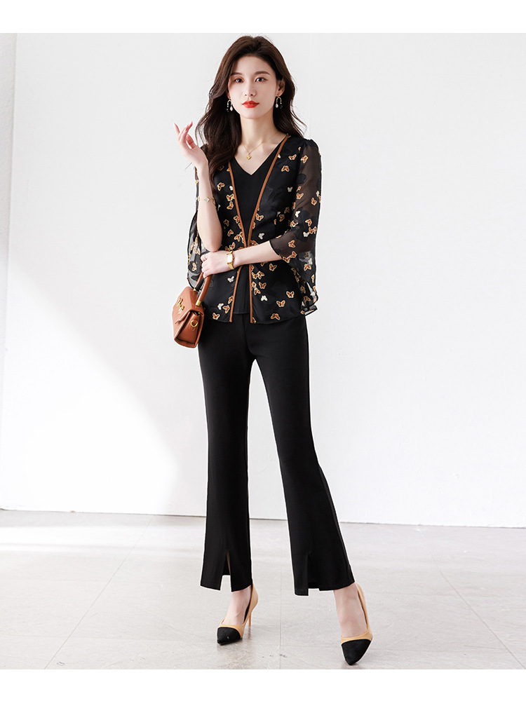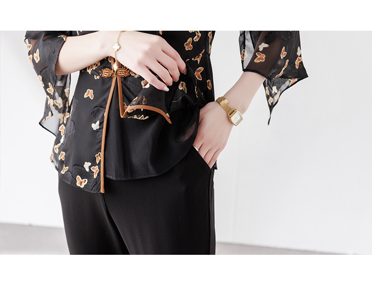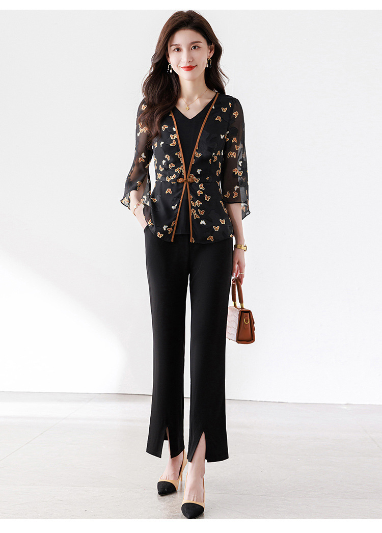 夏季新款,优雅两件套雪纺印花中袖打底衫高腰长款微喇裤套装QYM-TB-CY1029-Y