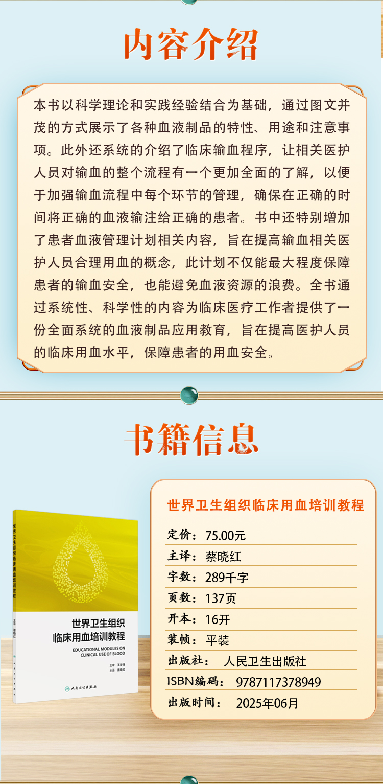 本书以科学理论和实践经验结合为基础,通过图文并茂的方式展示了各种血液制品的特性、用途和注意事项。此外还系统的介绍了临床输血程序,让相关医护人员对输血的整个流程有一个更加全面的了解,以便于加强输血流程中每个环节的管理,确保在正确的时间将正确的血液输注给正确的患者。书中还特别增加了患者血液管理计划相关内容,旨在提高输血相关医护人员合理用血的概念,此计划不仅能最大程度保障患者的输血安全,也能避免血液资源的浪费。全书通过系统性、科学性的内容为临床医疗工作者提供了一份全面系统的血液制品应用教育,旨在提高医护人员的临床用血水平,保障患者的用血安全。