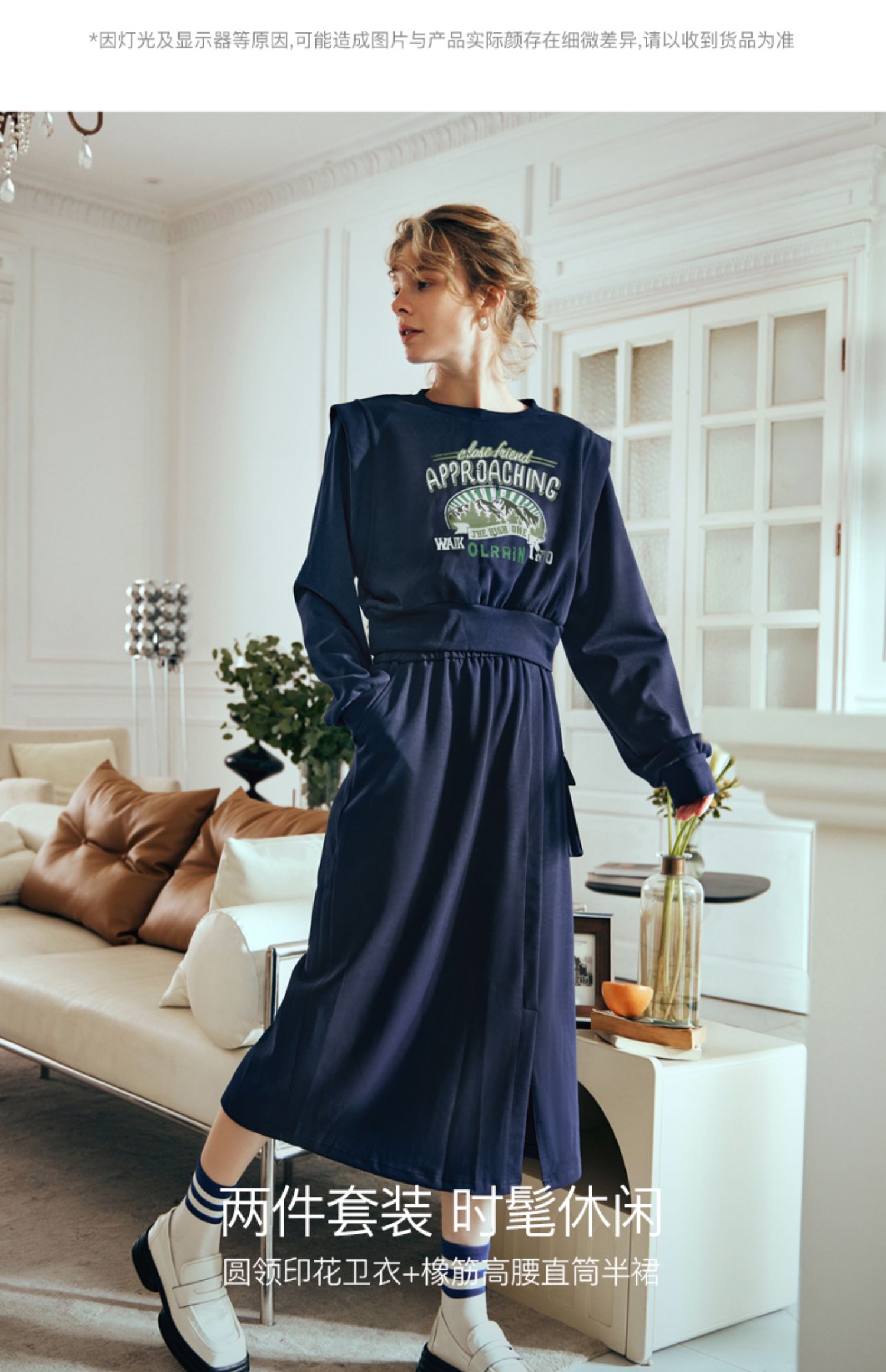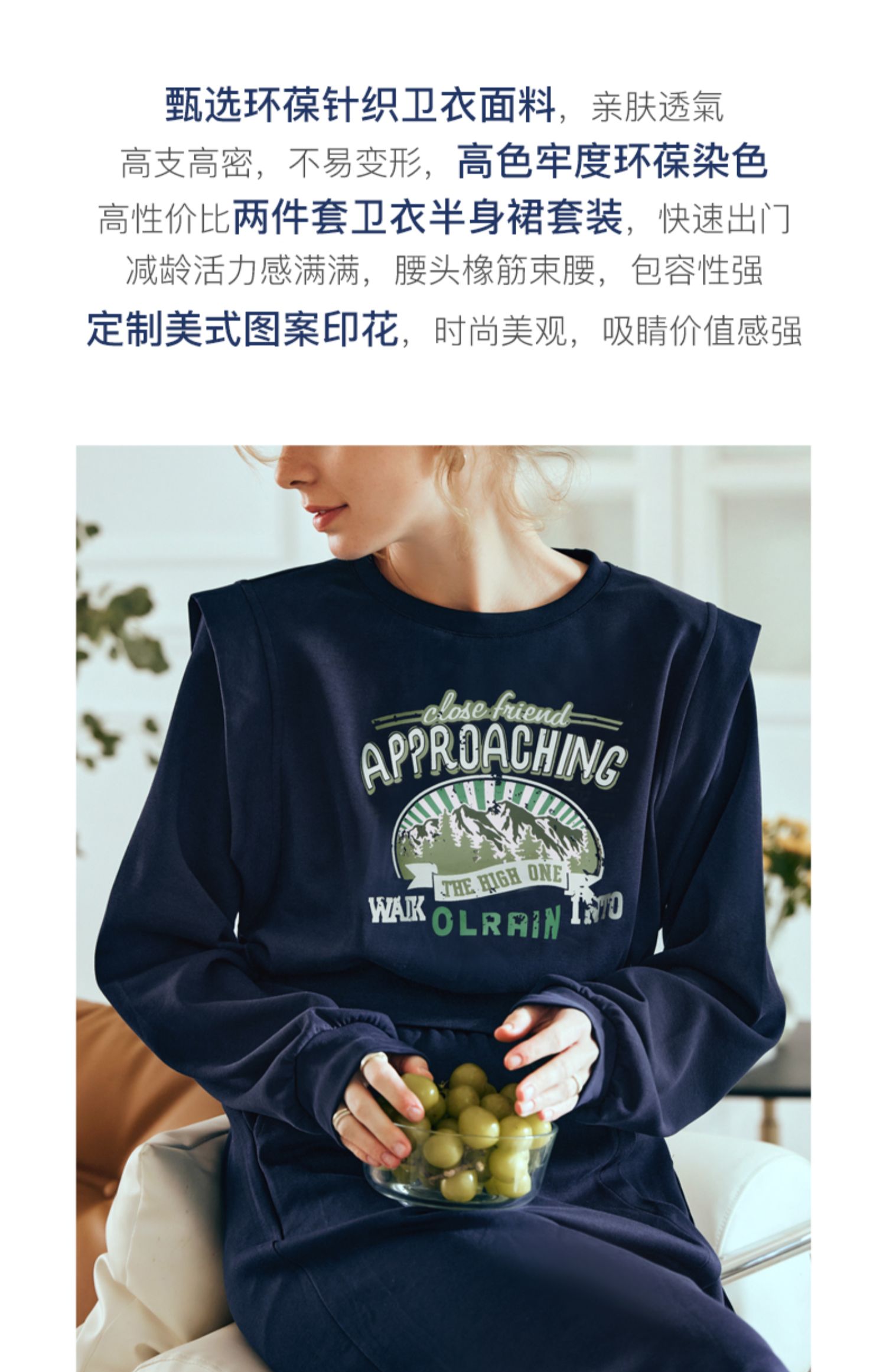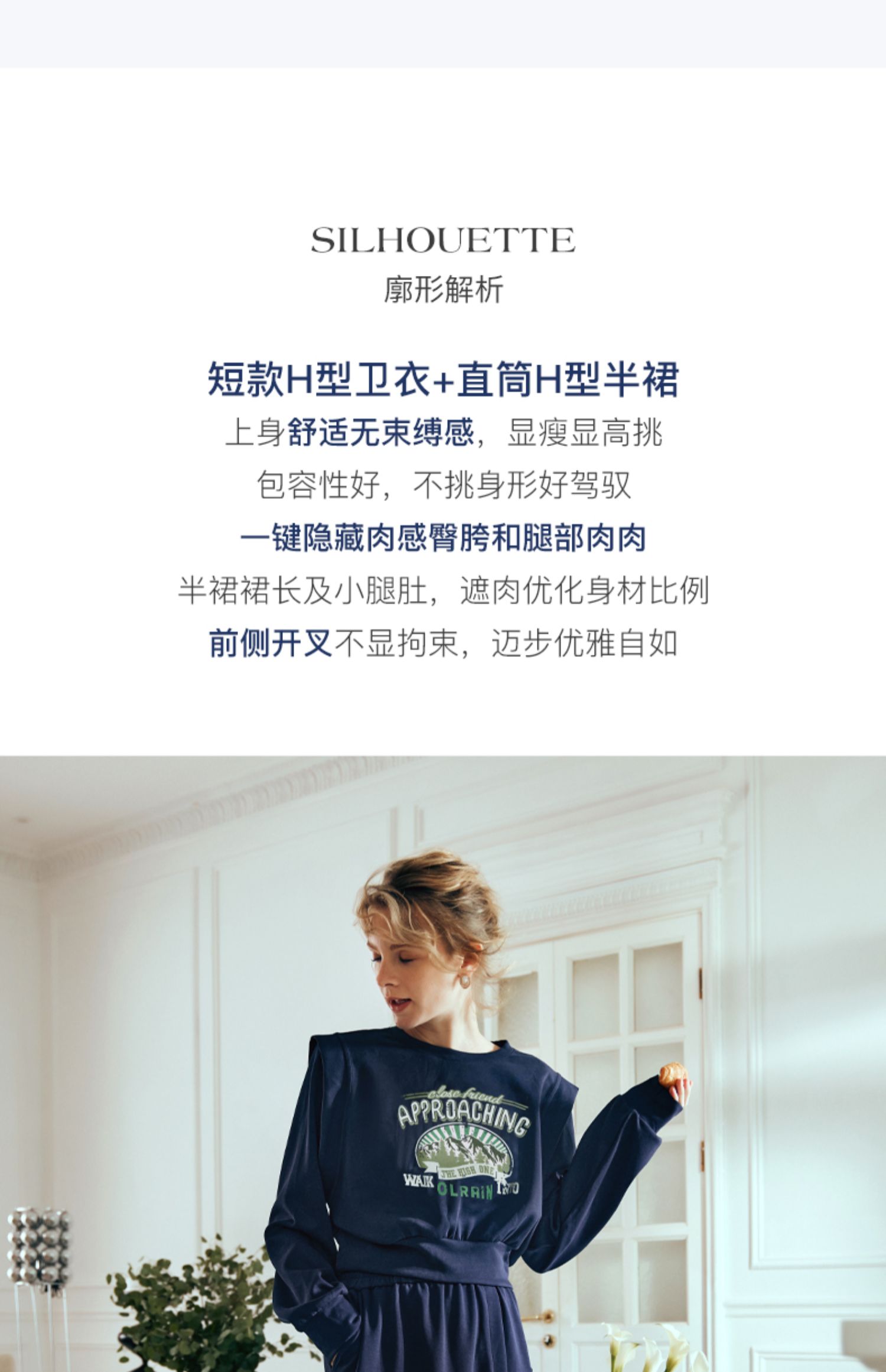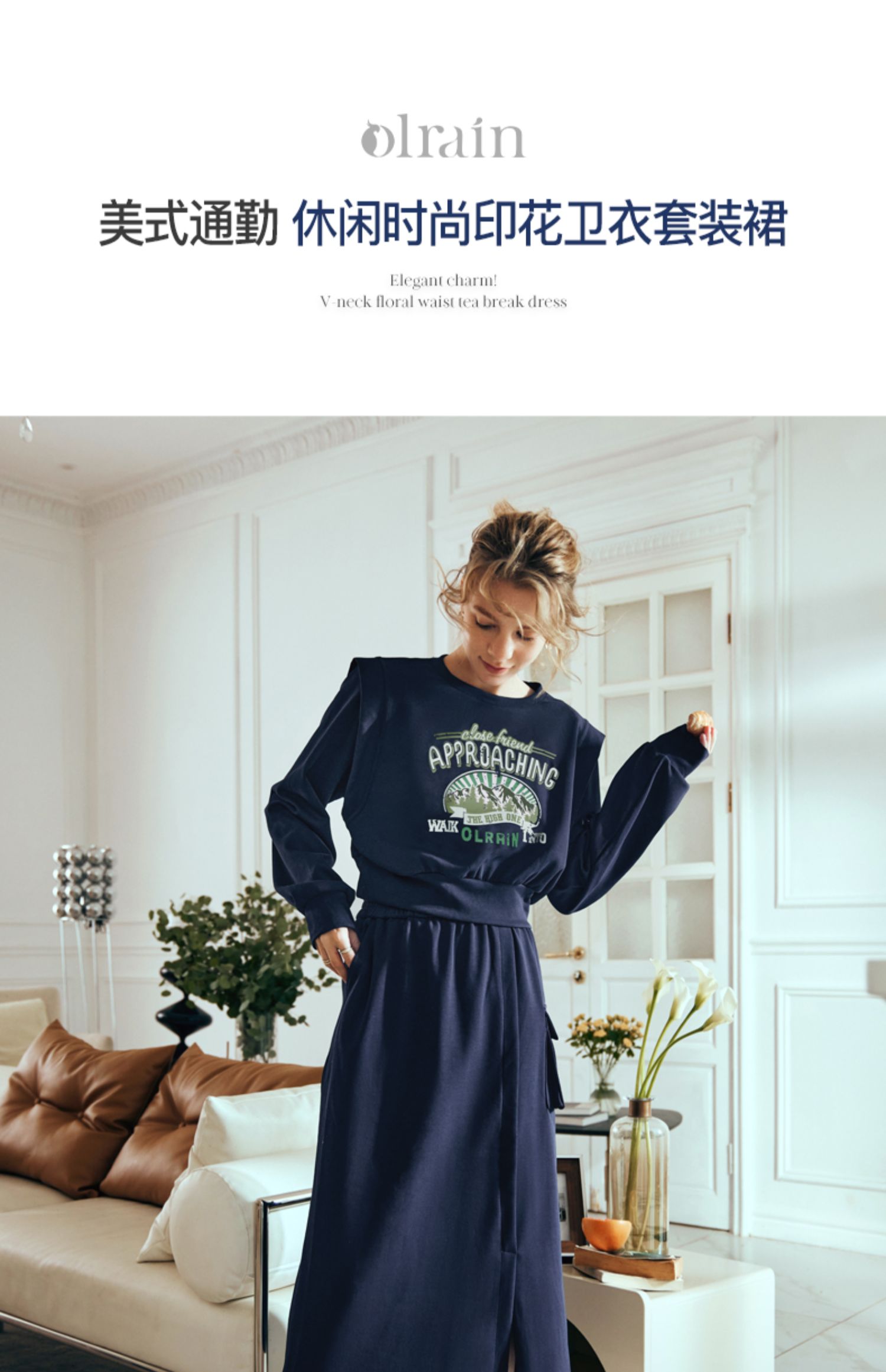 OLrain欧芮儿宝蓝色卫衣套装女早春2024年新款通勤美式印花两件套
