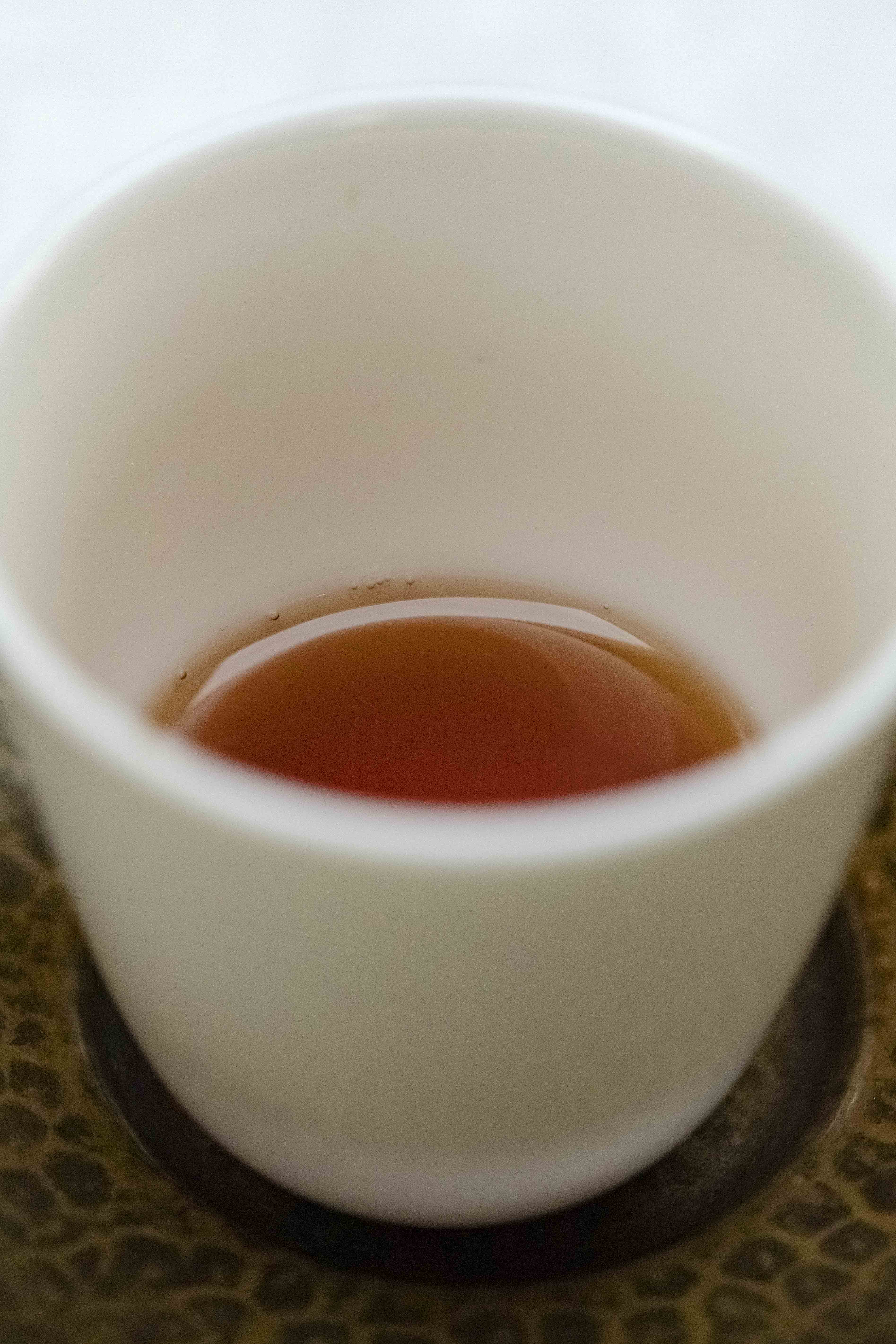 三,茶汤:如红酒般醇厚,色泽红褐色透亮,晶莹剔透,口感顺滑。