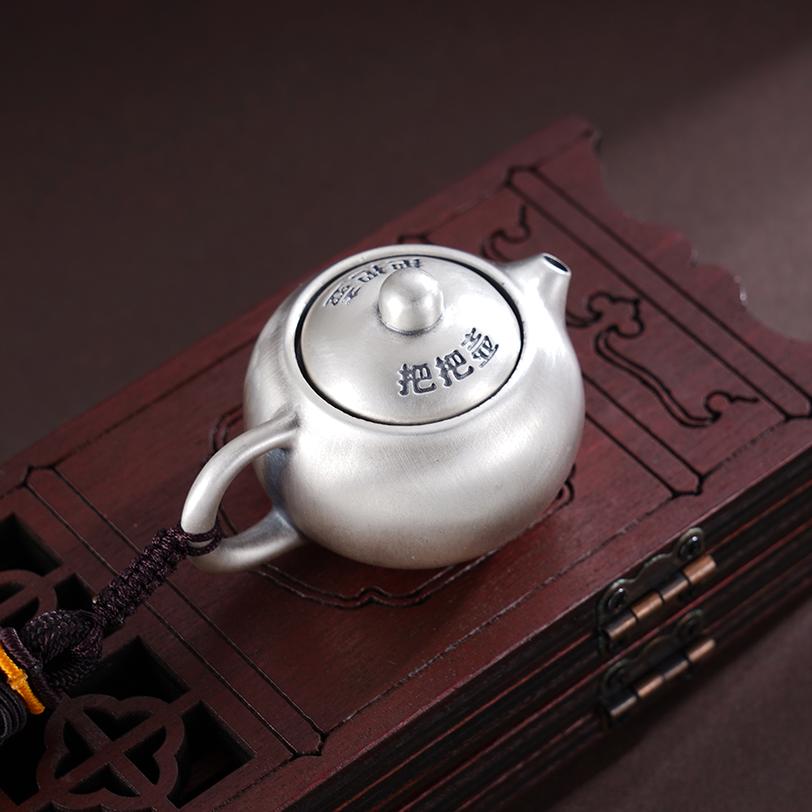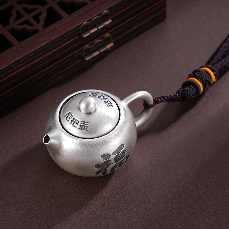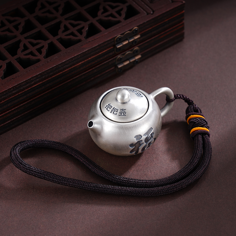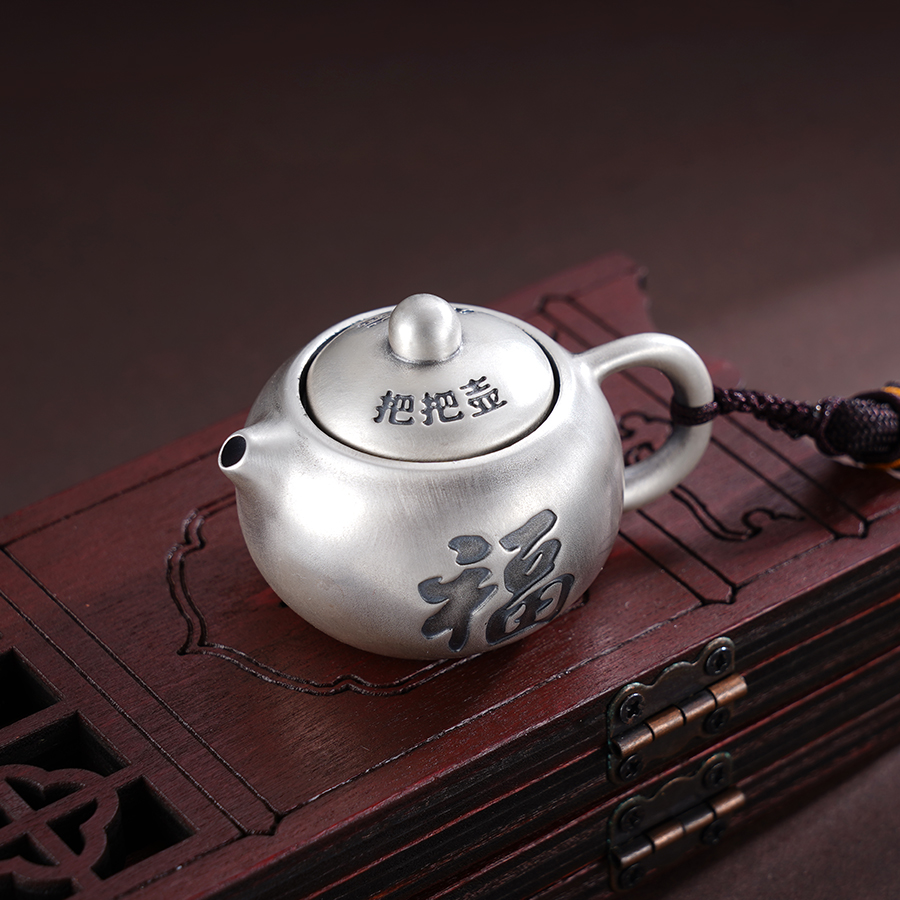 【寓意】:手把件呈圆润茶壶形,“壶盖”转动灵活,妙趣横生。“壶面”錾刻福字,简洁明了,寓意福壶共生,壶转好运。