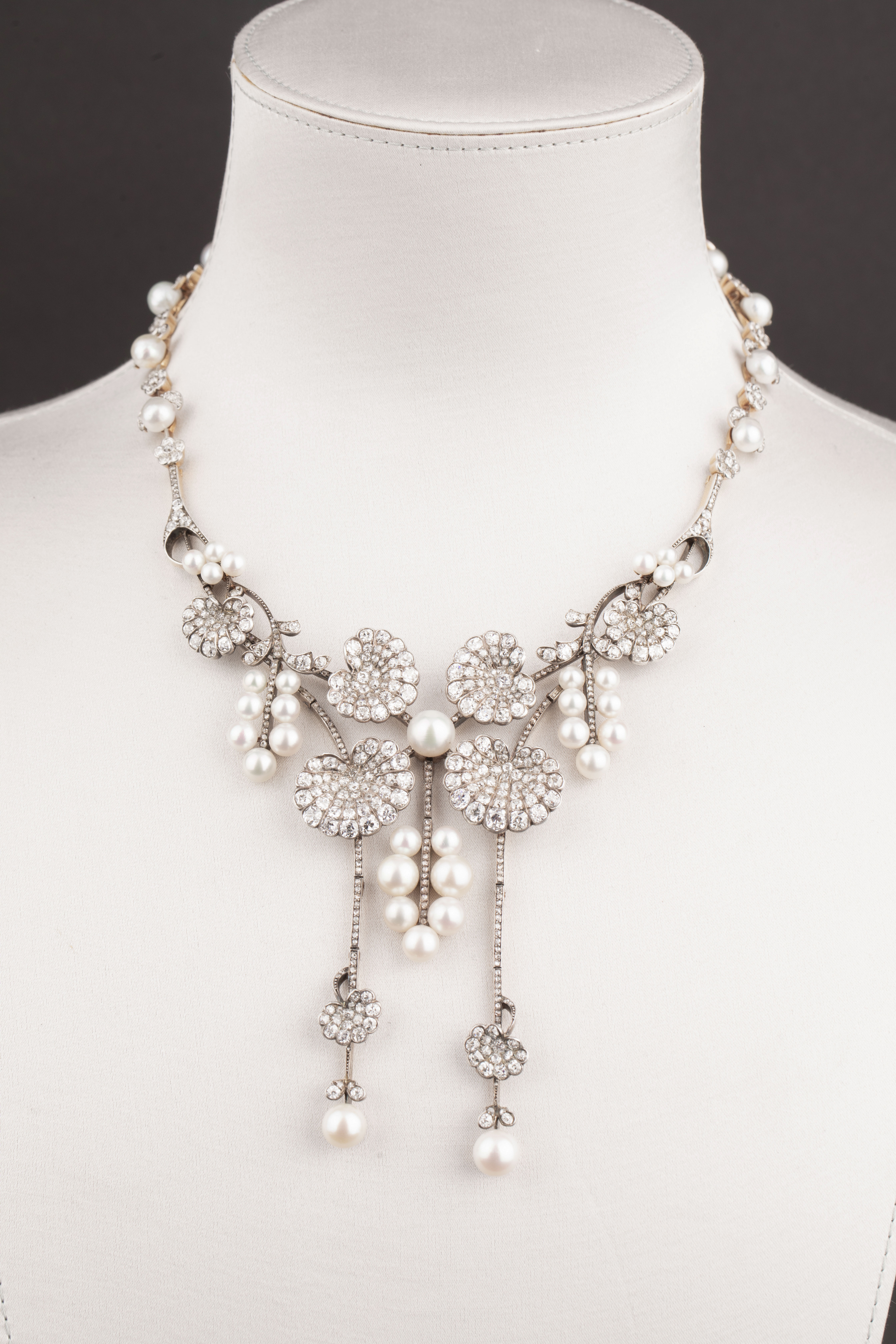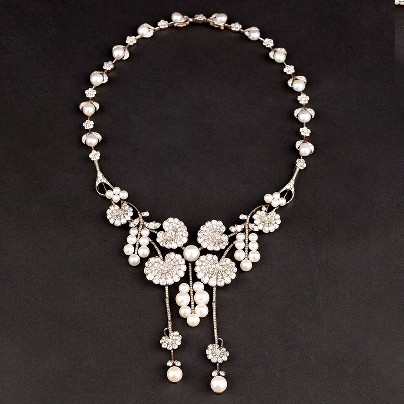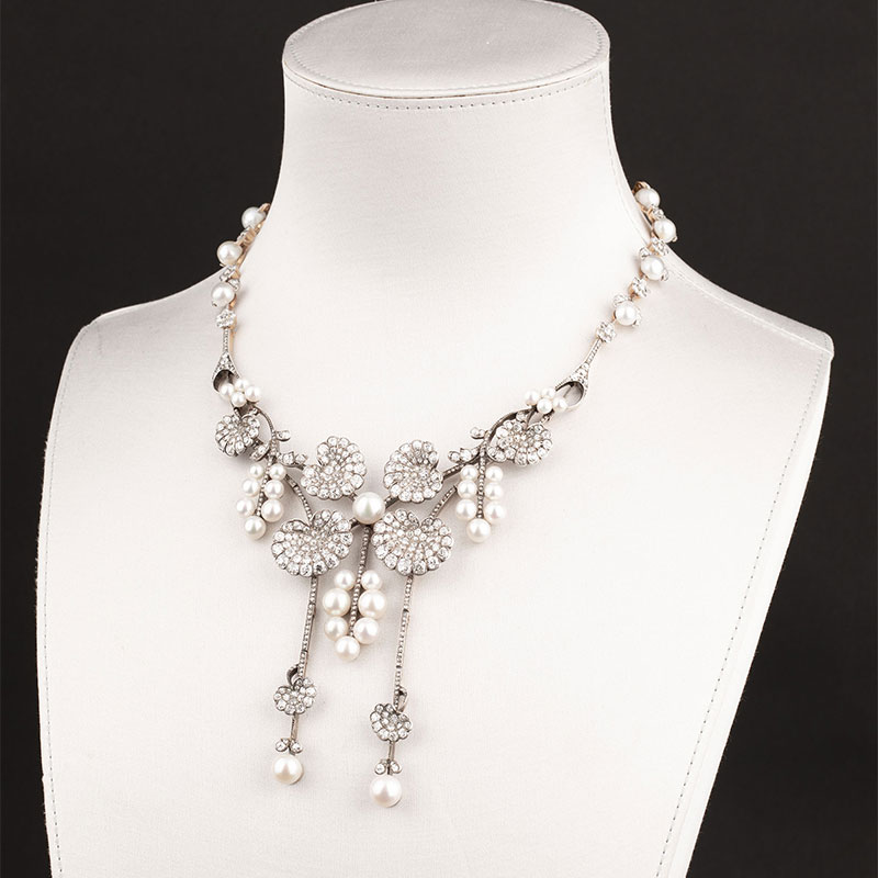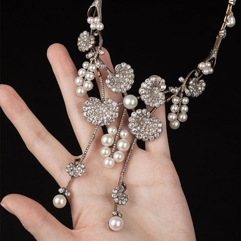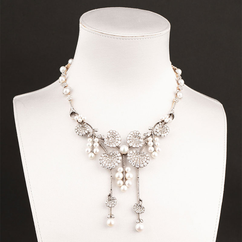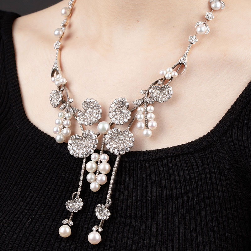 1900年代法国出品新艺术风格18k黄金白银镶嵌钻石及天然海水珍珠项链