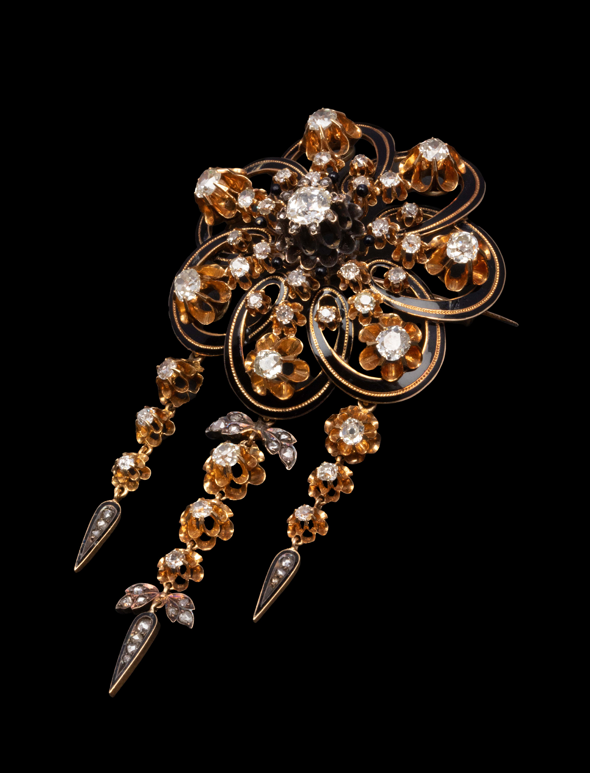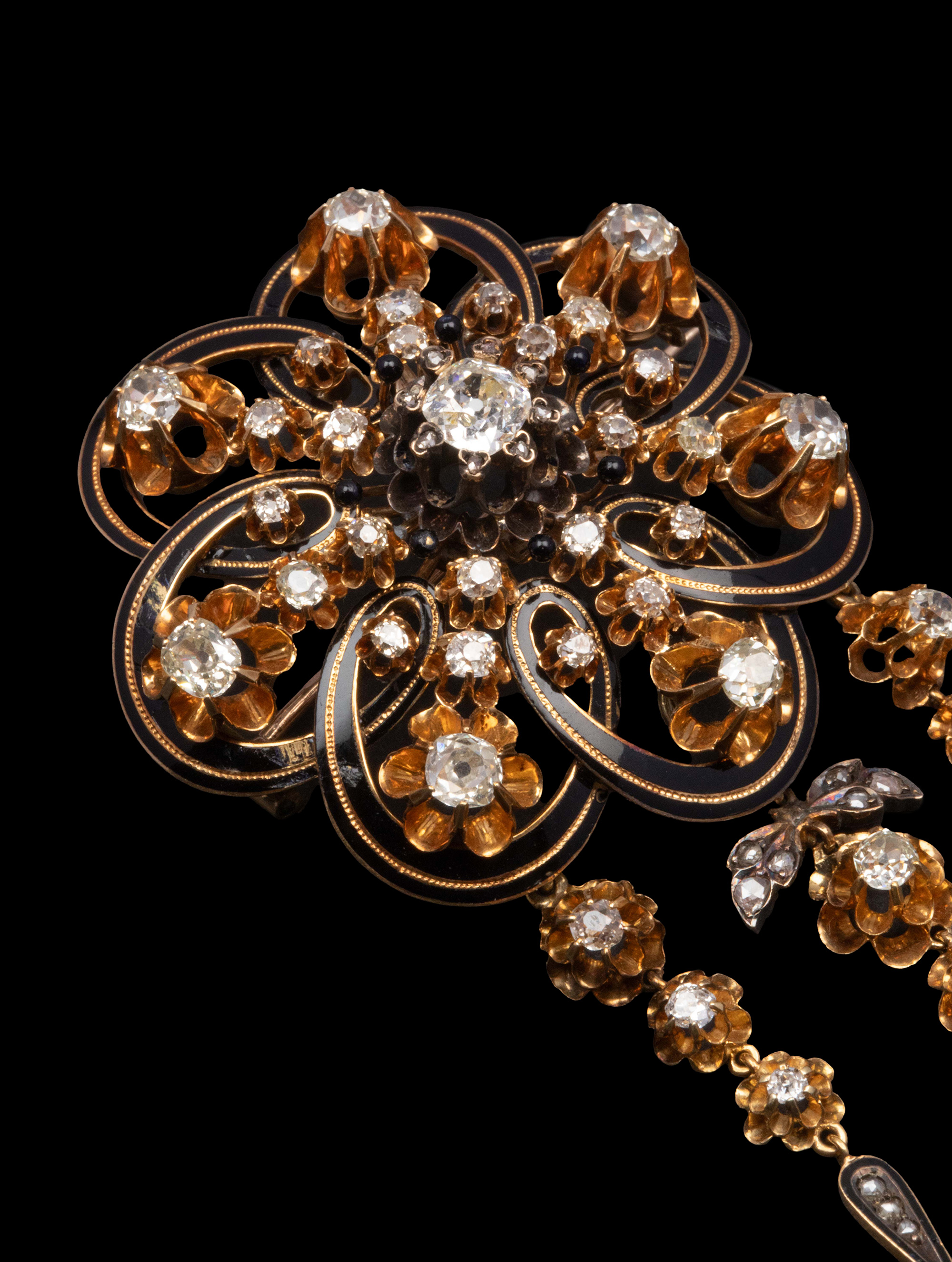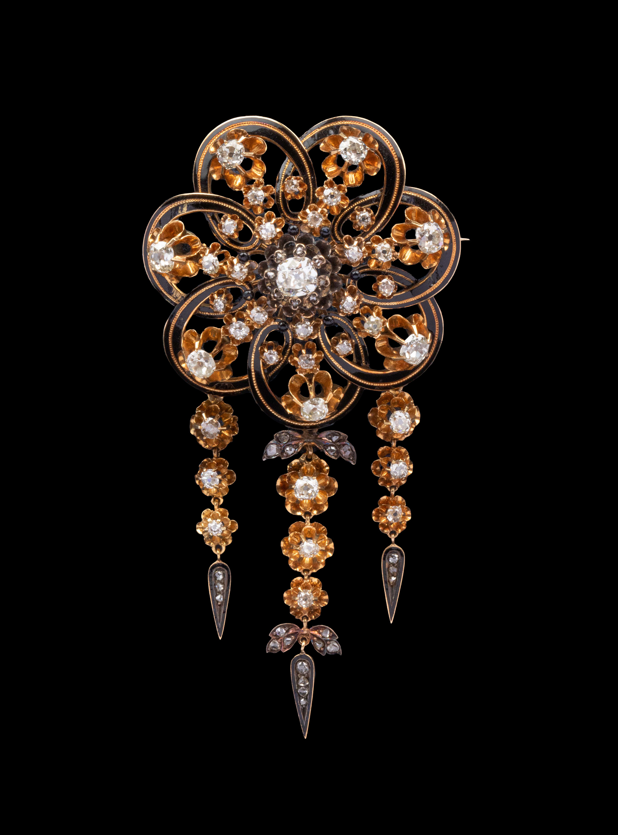 1850-1870年代欧洲出品18K黄金镶嵌钻石及珐琅花卉流苏造型胸针