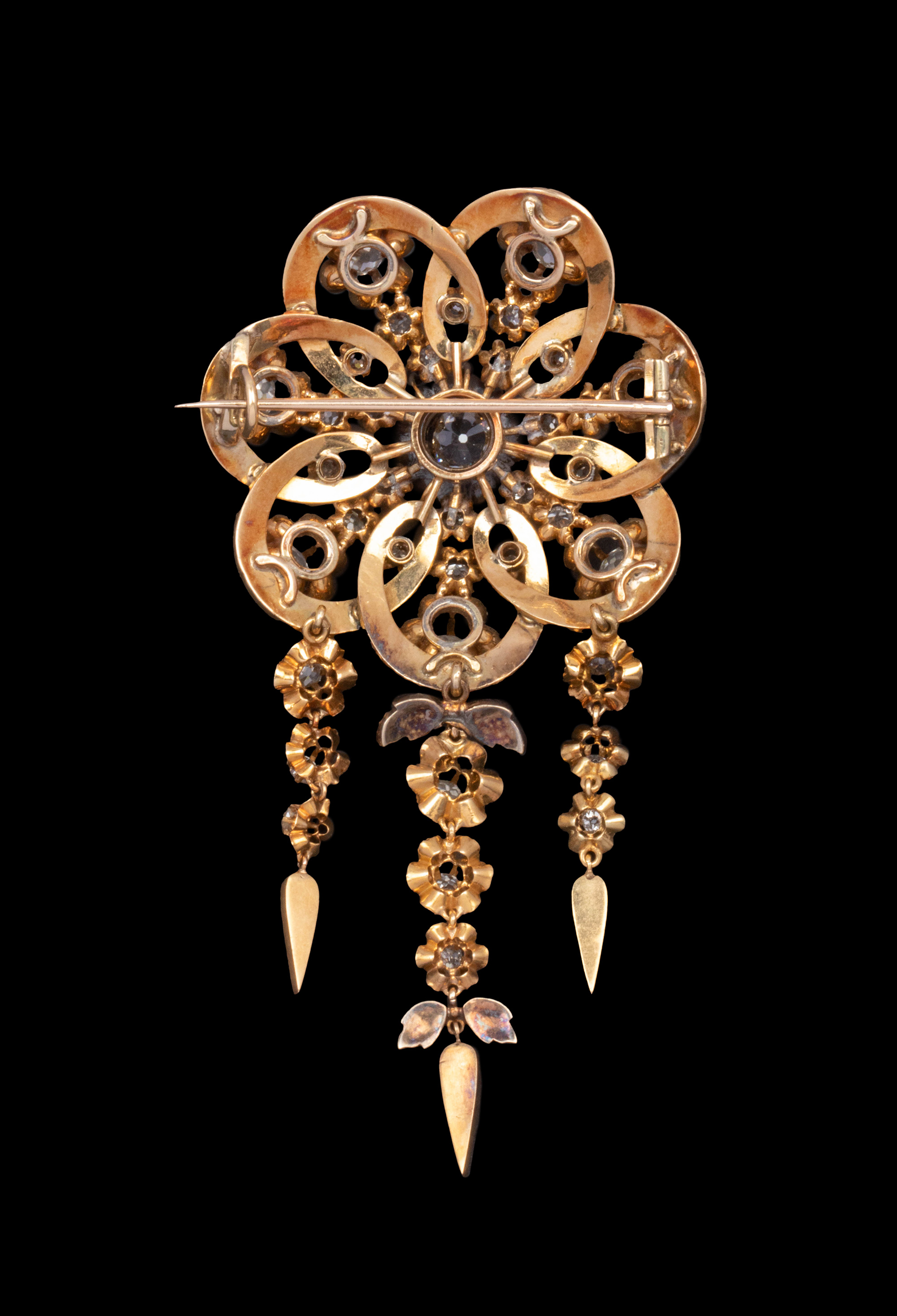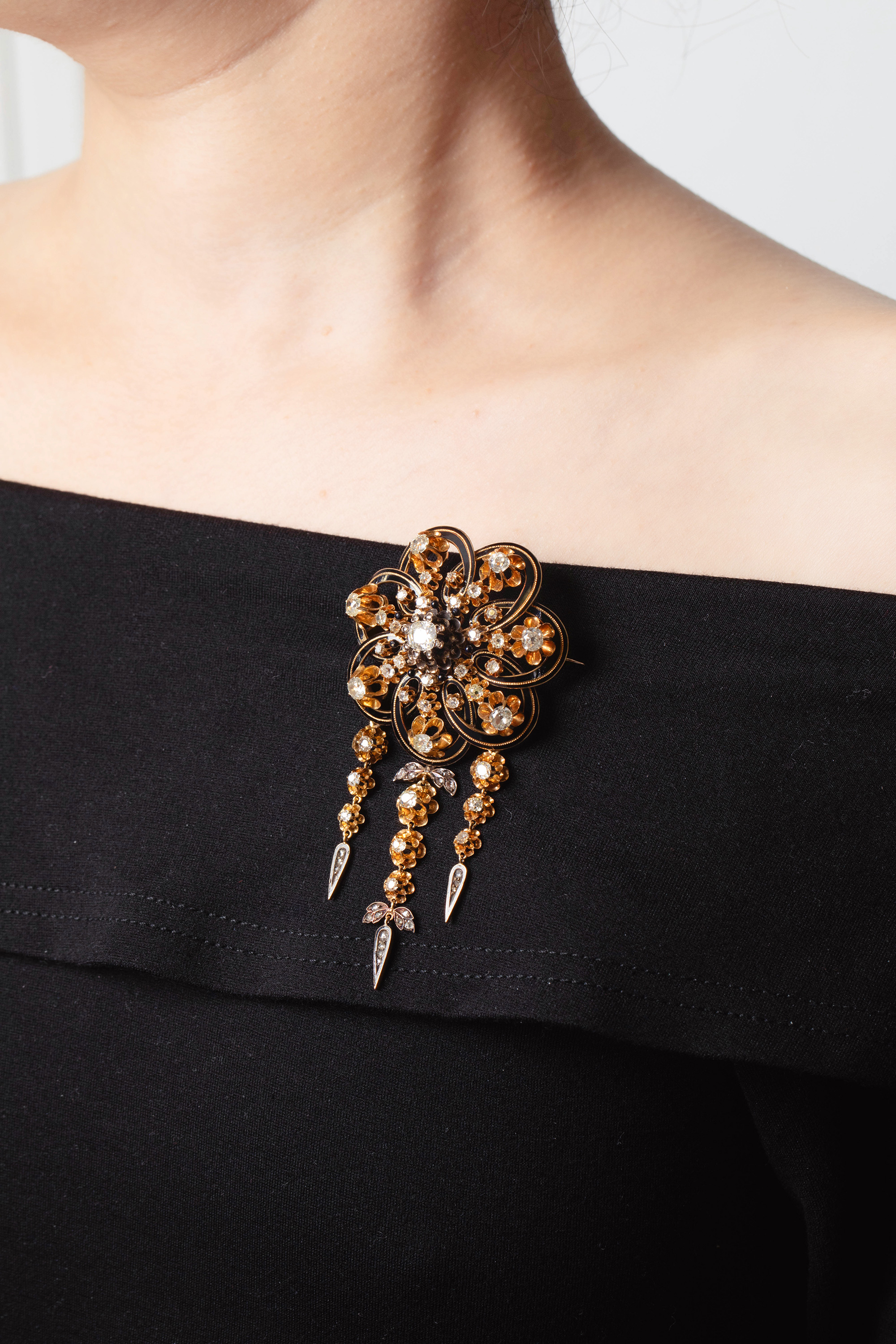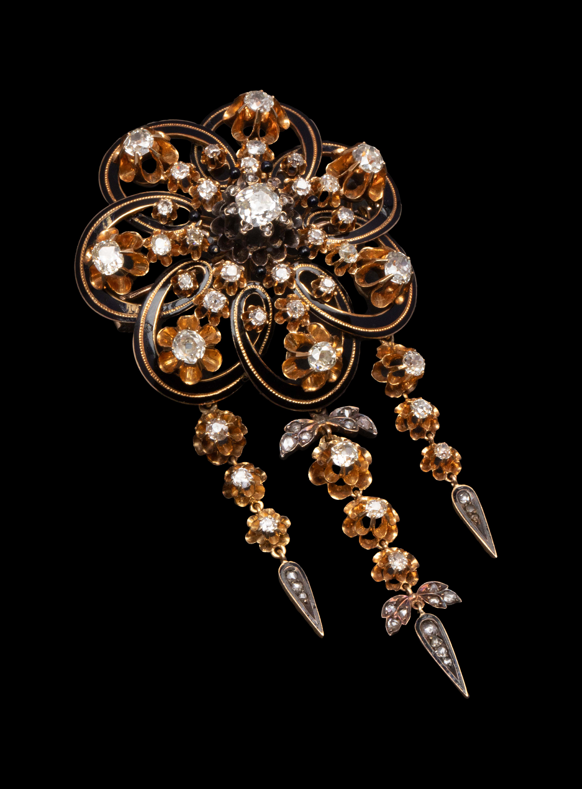1850-1870年代欧洲出品18K黄金镶嵌钻石及珐琅花卉流苏造型胸针