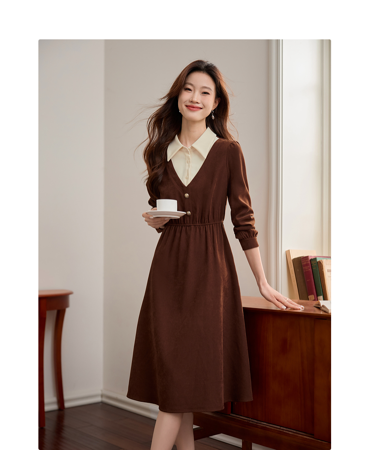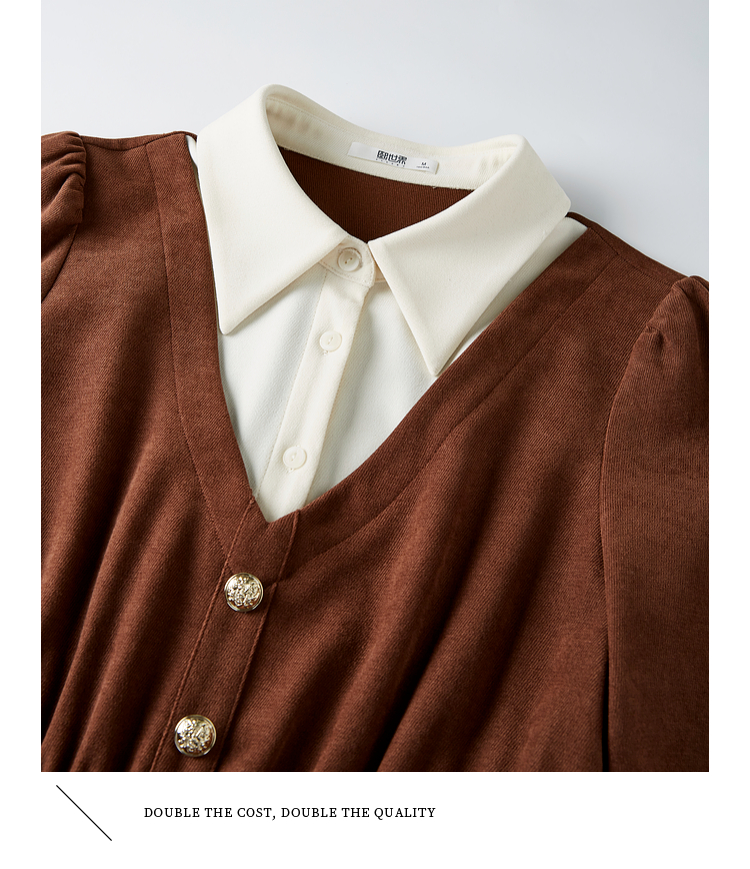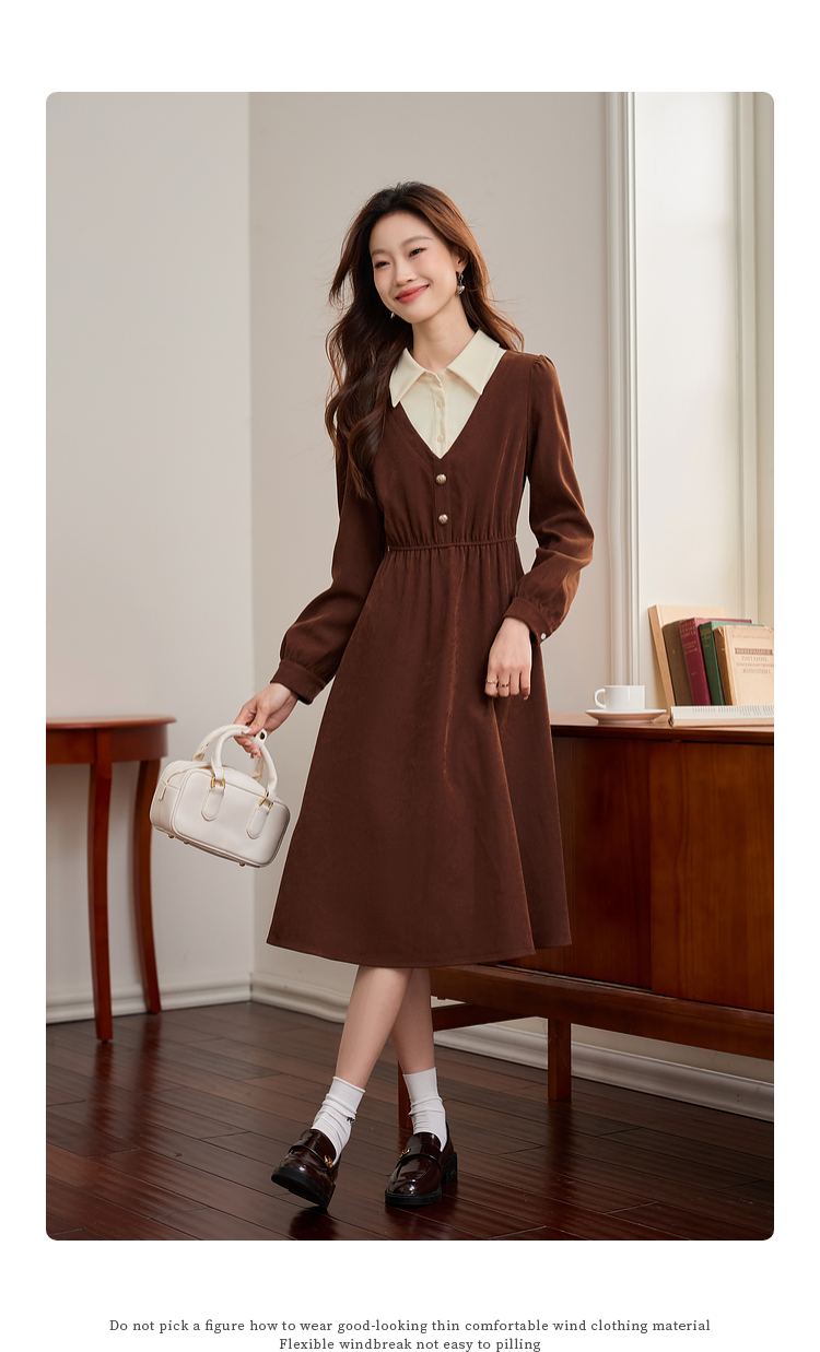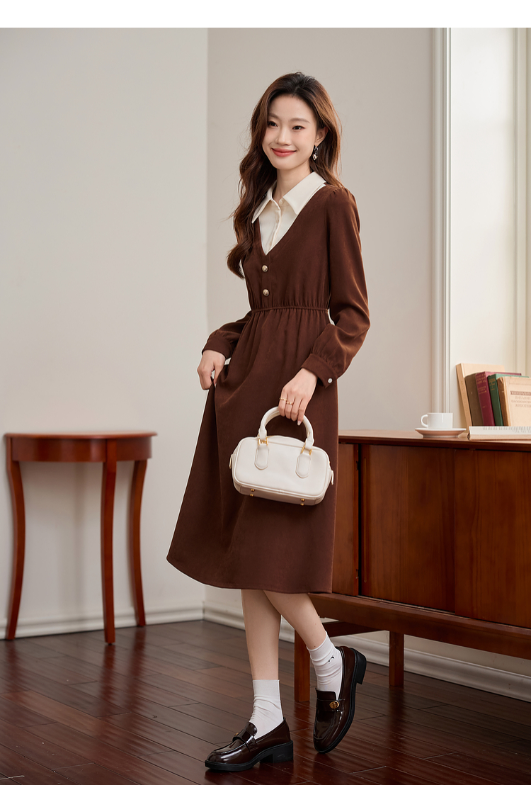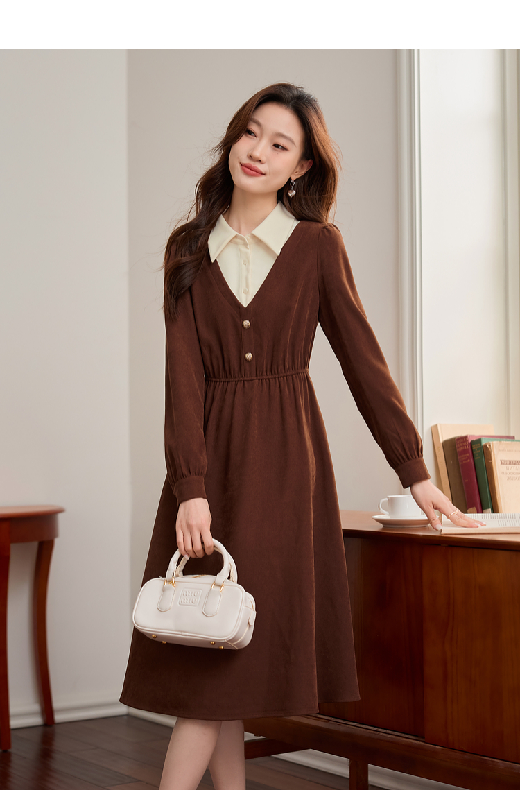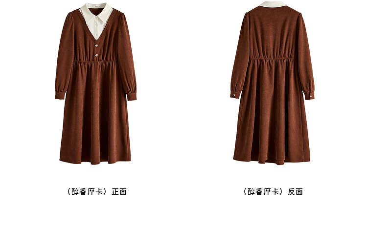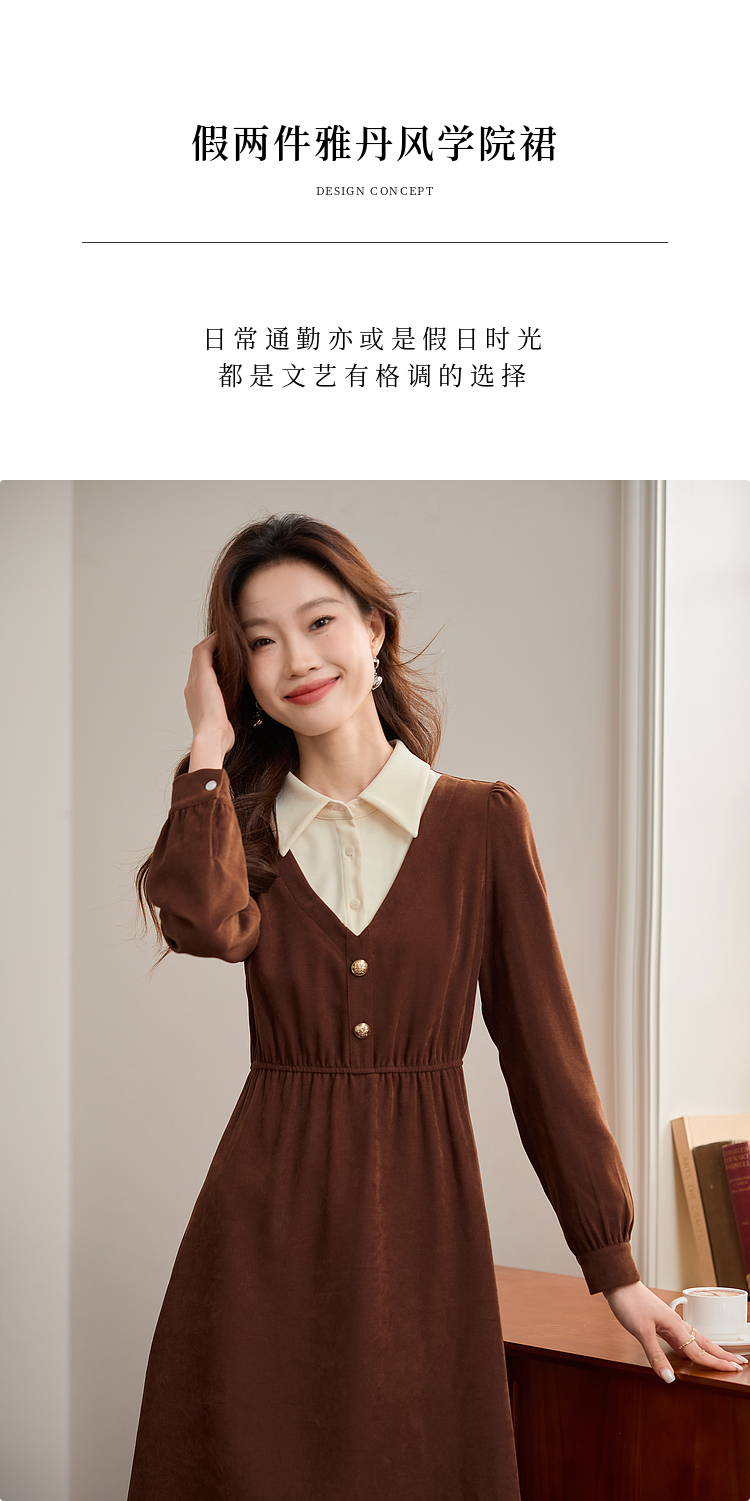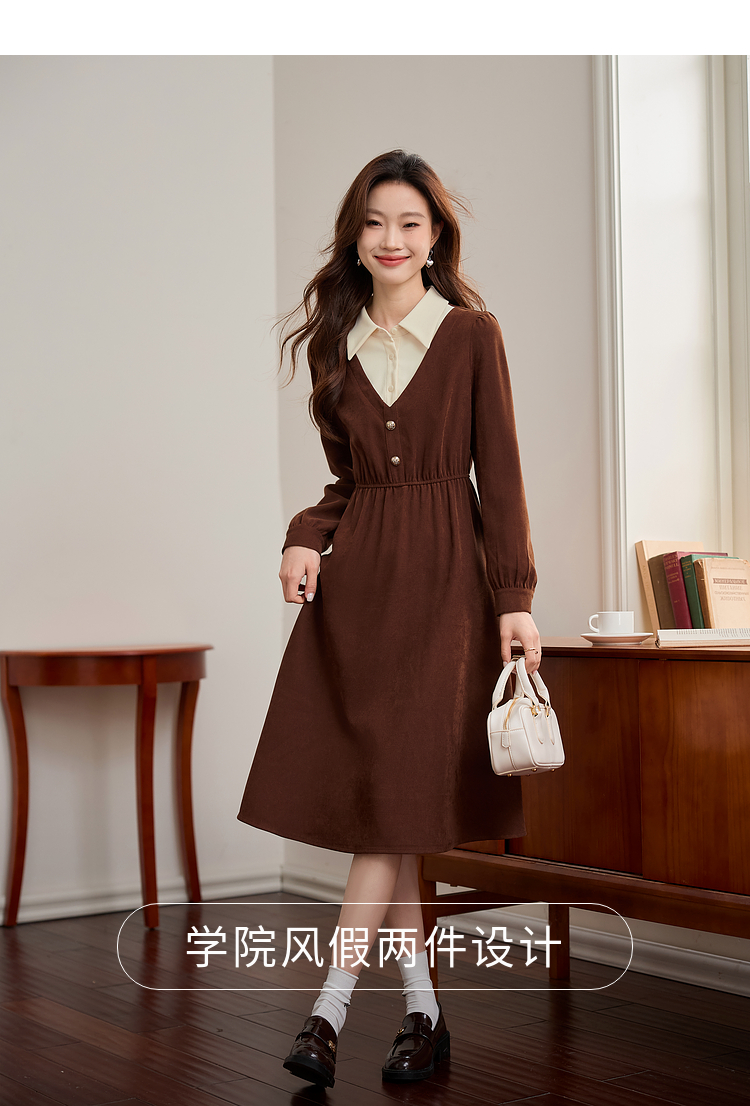 【专属特价】熙世界学院风撞色POLO领连衣裙秋冬通勤气质收腰显瘦假两件裙子