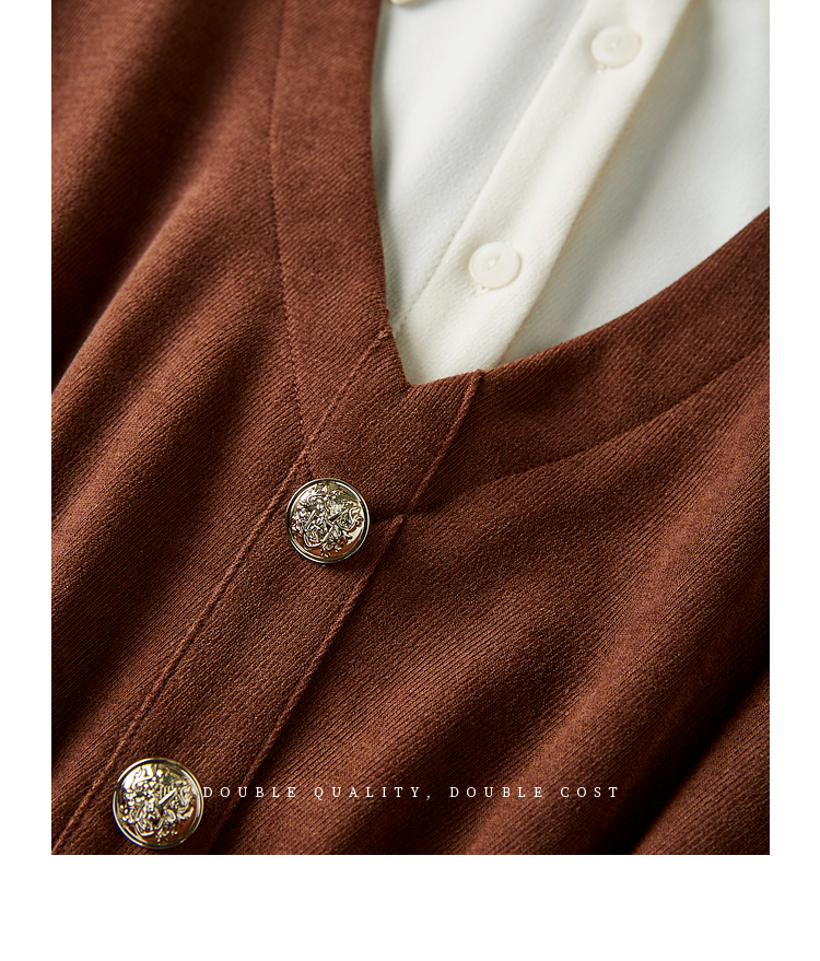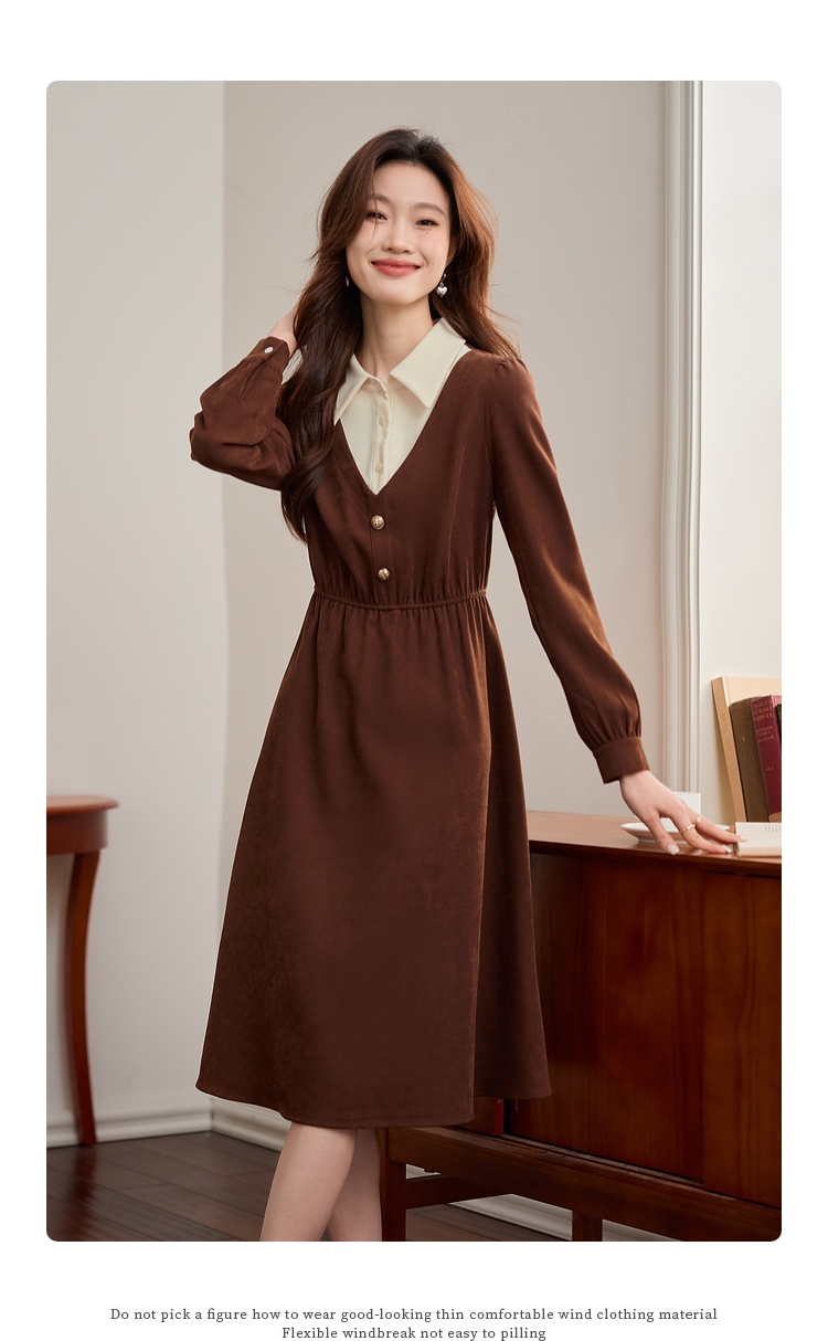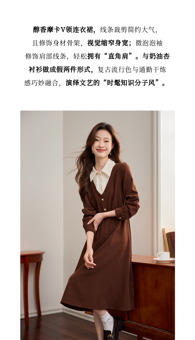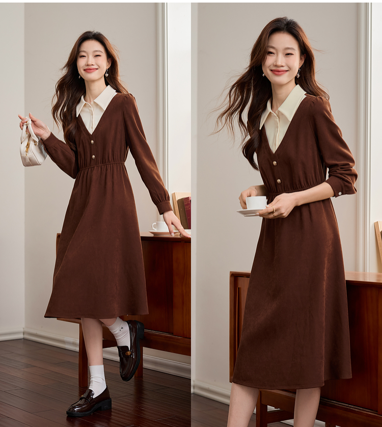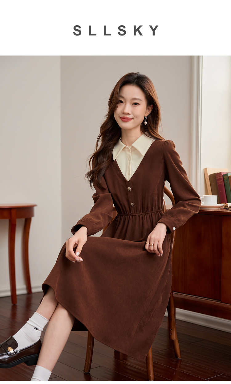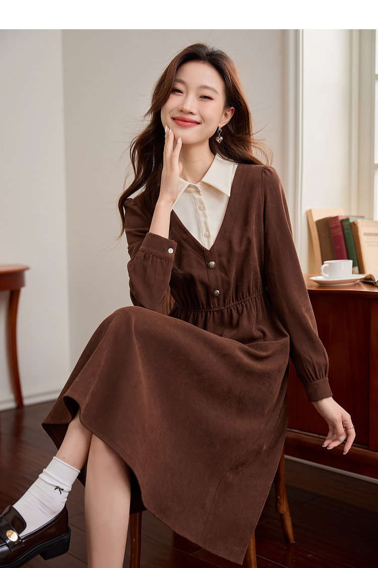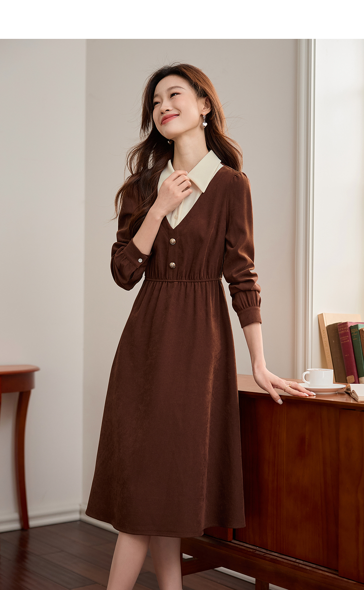 【专属特价】熙世界学院风撞色POLO领连衣裙秋冬通勤气质收腰显瘦假两件裙子