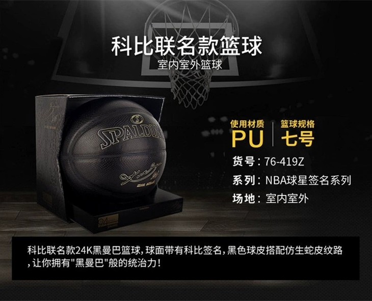 斯伯丁篮球科比联名款24K黑曼巴签名纪念典藏限量版室内室外7号球礼盒装 货号76-419Z 品名:NBA比赛用球 系列:经典系列 规格:7号(标准球 ) 场地:适合室内室外