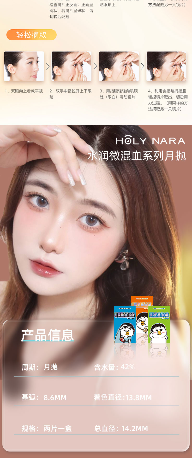 【月抛】Holy Nara 月半叽 直径:14.2mm 含水量42%(月抛2片/盒 不同度数请拍两盒)