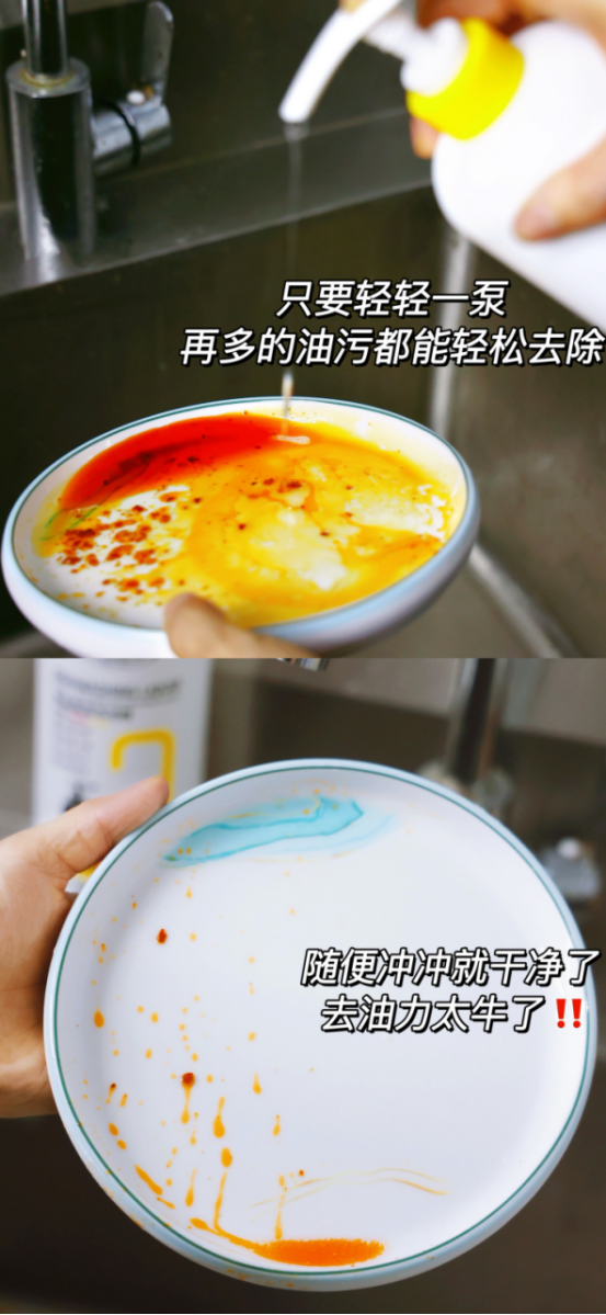 不管是多么重油的餐具,就算是冷水清洗 只要滴上去就能快速瓦解油渍 一冲油渍快速带走,每个盘子都能洗得锃光瓦亮 搓出干净的“嘎吱”声