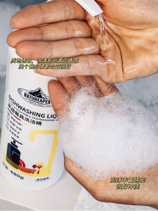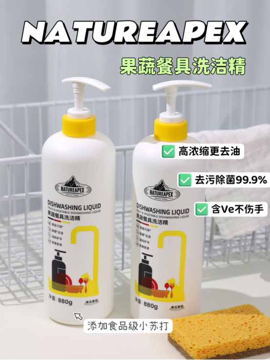 洗洁精选错,清洁后污渍残留、化学残留、农药残留…… 每天的入口器具食品清洁不到位 不仅让生活品质大打折扣 还危害着整个家庭的健康! 而一款好的洗洁精真是可以造福家庭 让繁琐的家务变得轻松~ 今天给大家推荐一款性价比|实用性|安全性 三方面都高分的洗洁精—— 【NATUREAPEX果蔬餐具洗洁精】 · 高浓缩配方,用量节省效果好 · 冷水快速去油,一滴瓦解重油 · 天然成分来源,果蔬+母婴可用A类标准 · 99.9%除菌+去农残,守护入口健康 · 添加护手VE成分,徒手洗碗手不干 ☑餐具锅具 ☑水杯奶瓶 ☑瓜果蔬菜 ☑刀具砧板 多种清洁需求一瓶就搞定,一键“减负”家务工作