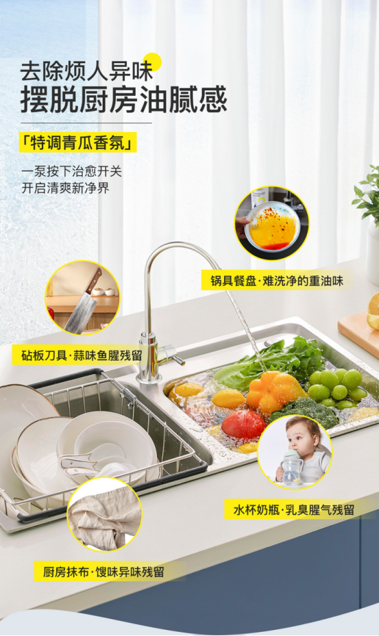 ▲有效除异味·清新青瓜香氛 很多洗洁精只做到了去油污不能去异味 煮火锅的锅子、吃螺蛳粉的碗每次都得洗好几遍 还有装过鸡蛋的碗、切过大蒜的砧板和刀…… 洗完了凑近闻,还是能闻到淡淡的异味 而这两点可以放心交给ta! 有去异味的buff叠加 饭菜油腻腥味异味一冲bye-bye! 只剩下一股令人愉悦的青瓜香