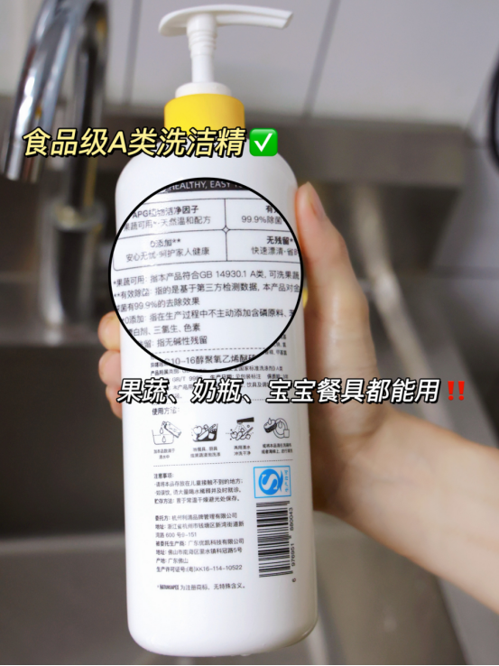 属于食安认可的A类洗洁精,实际无毒级别 是能清洗果蔬+母婴可用的安心标准 可以放心洗宝宝的奶瓶、餐具 取代那些贵贵的专业奶瓶清洗产品完全没问题