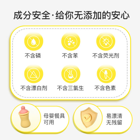 ▲实际无毒级·母婴安心适用 安全性这块ta做到了6大无添加 ☒不含磷 ☒不含苯 ☒不含荧光剂 ☒不含漂白剂 ☒不含三氯生 ☒不含色素