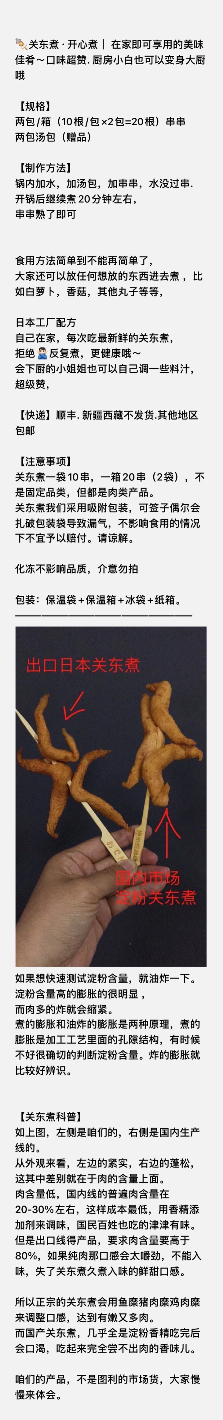 · 关东煮我们采用吸附包装,可签子偶尔会扎破包装袋导致漏气,不影响食用的情况下不宜予以赔付。请谅解。化冻不影响品质,介意勿拍