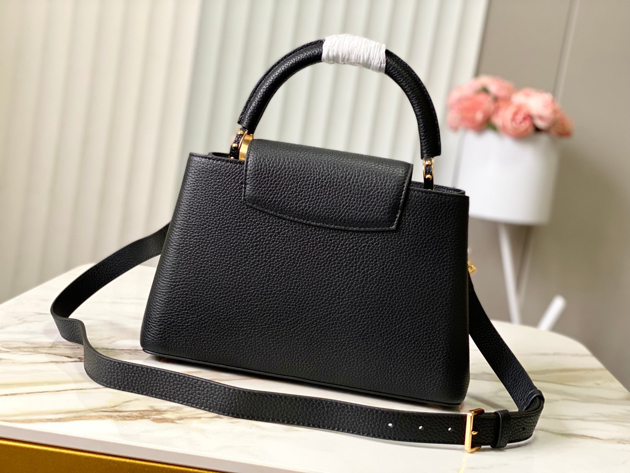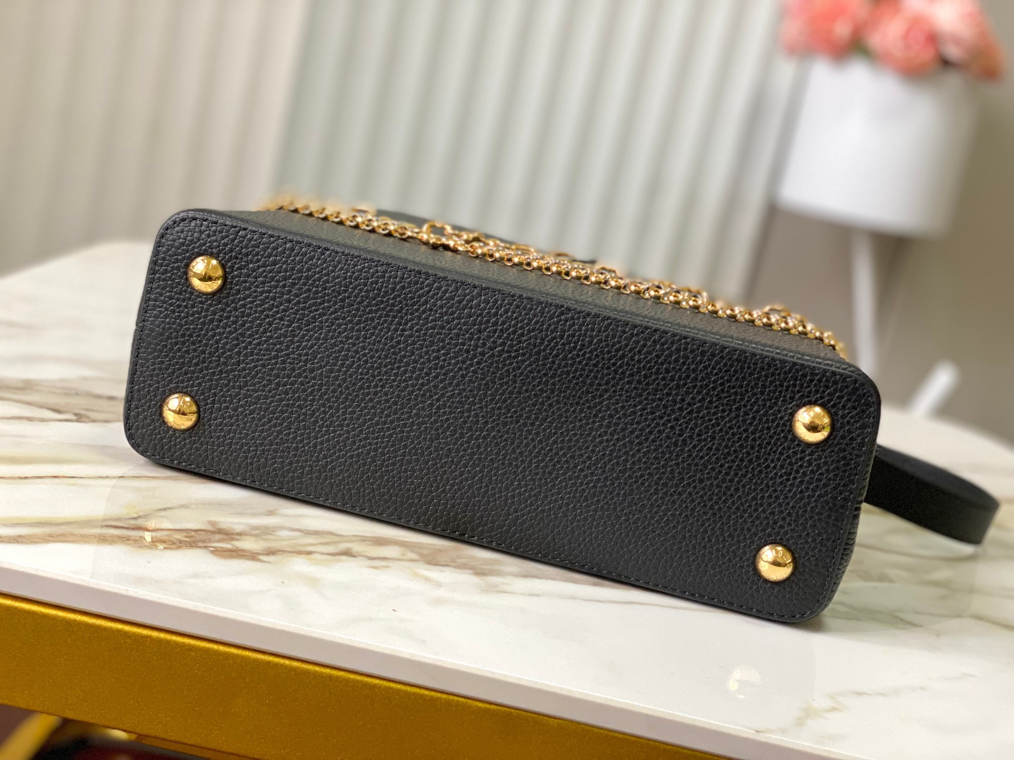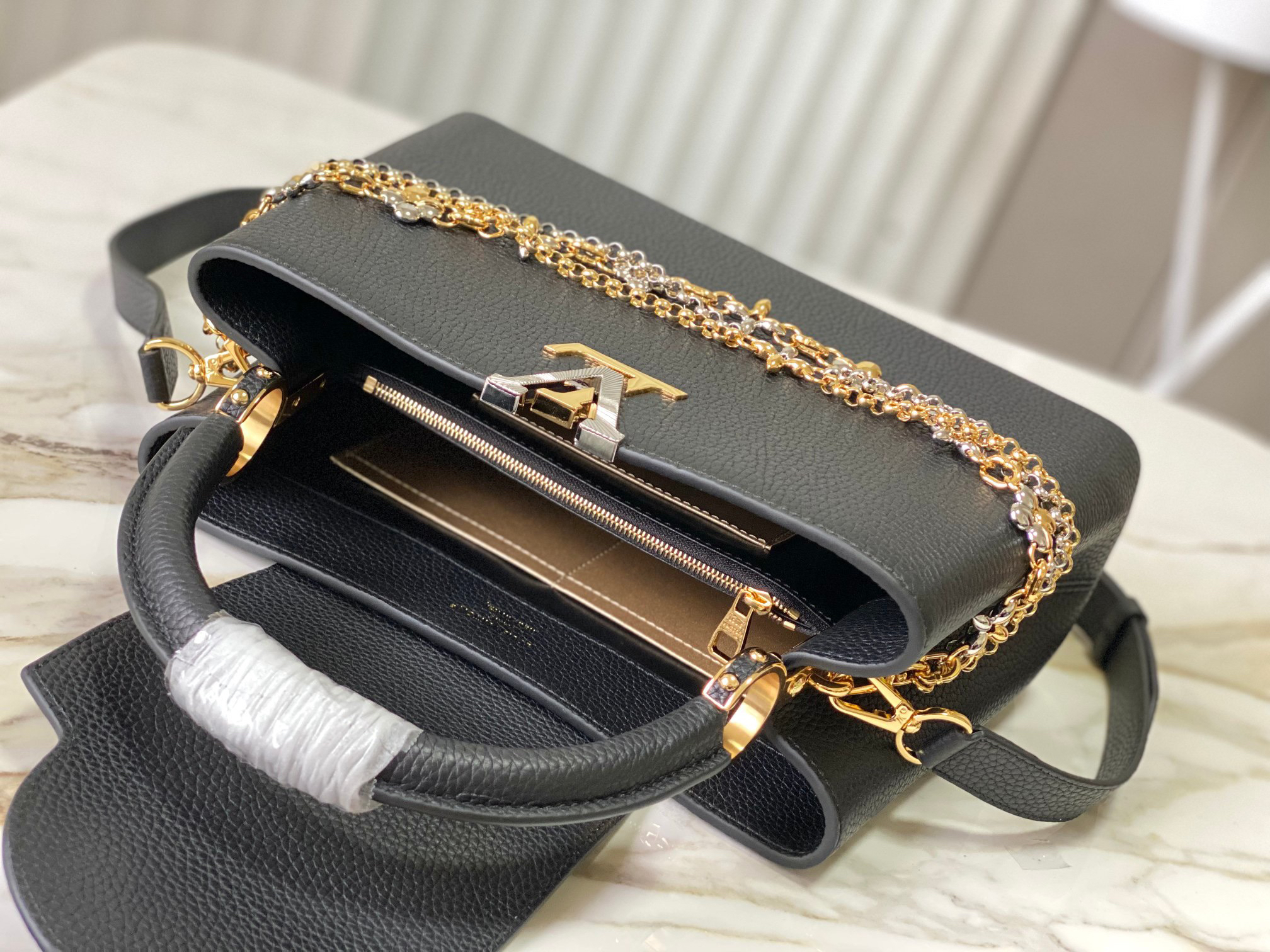 秋冬特惠💰1830 渠道级LV 新品 te级LV 动态芯片 M26814/M48865黑金光线链条款 这款Capucines采用引人注目的、精致的宝石色调版本装饰有品牌的双镀锌Infinity链条 采用Taurillon皮革制成 饰有标志性的Monogram花卉图案 以及LV首字母标识 这些标识经过独特的放射状效果处理 这种双重携带风格包括一个内部的扁平口袋 且有多种佩戴方式 Size : 31 * 20 * 11 CM