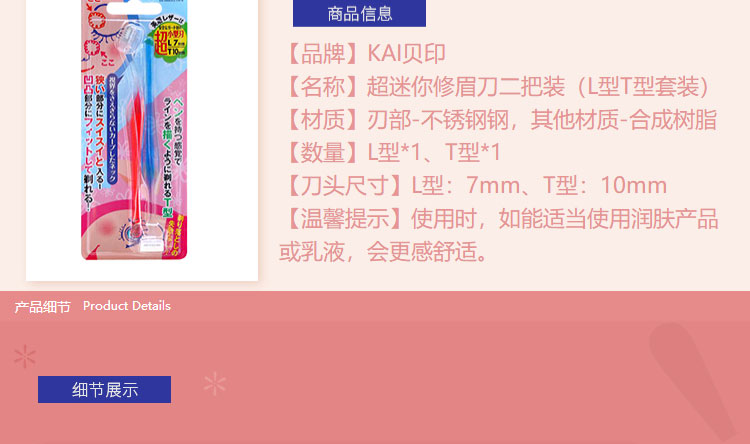 贝印(KAI)超迷你修眉毛刀二把装(L型T型套)精修刮眉刀 适合新手不易伤肤剃眉刀 修眉神器