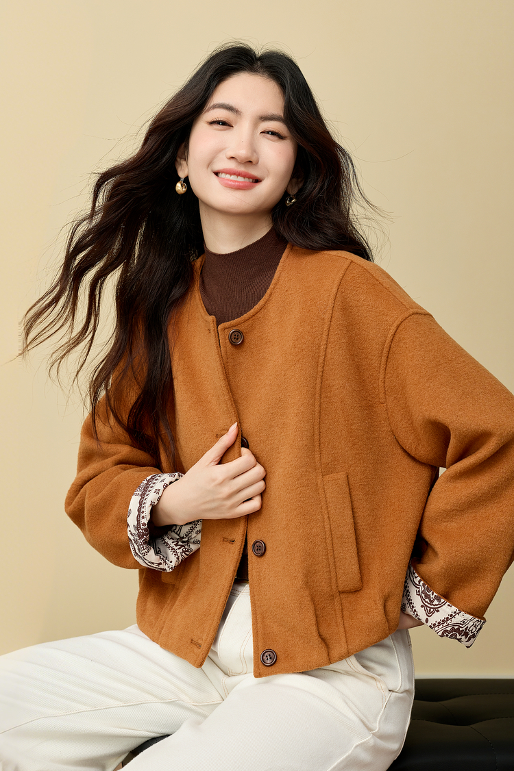 【周末秒杀】熙世界小香风花苞毛呢短外套女小个子秋冬季印花袖口圆领夹克上衣