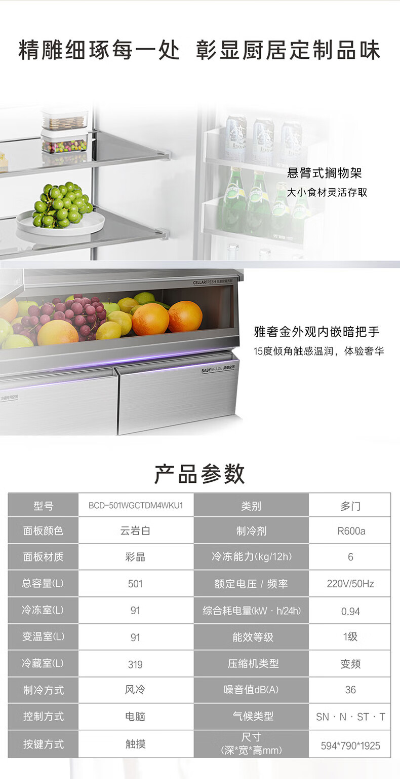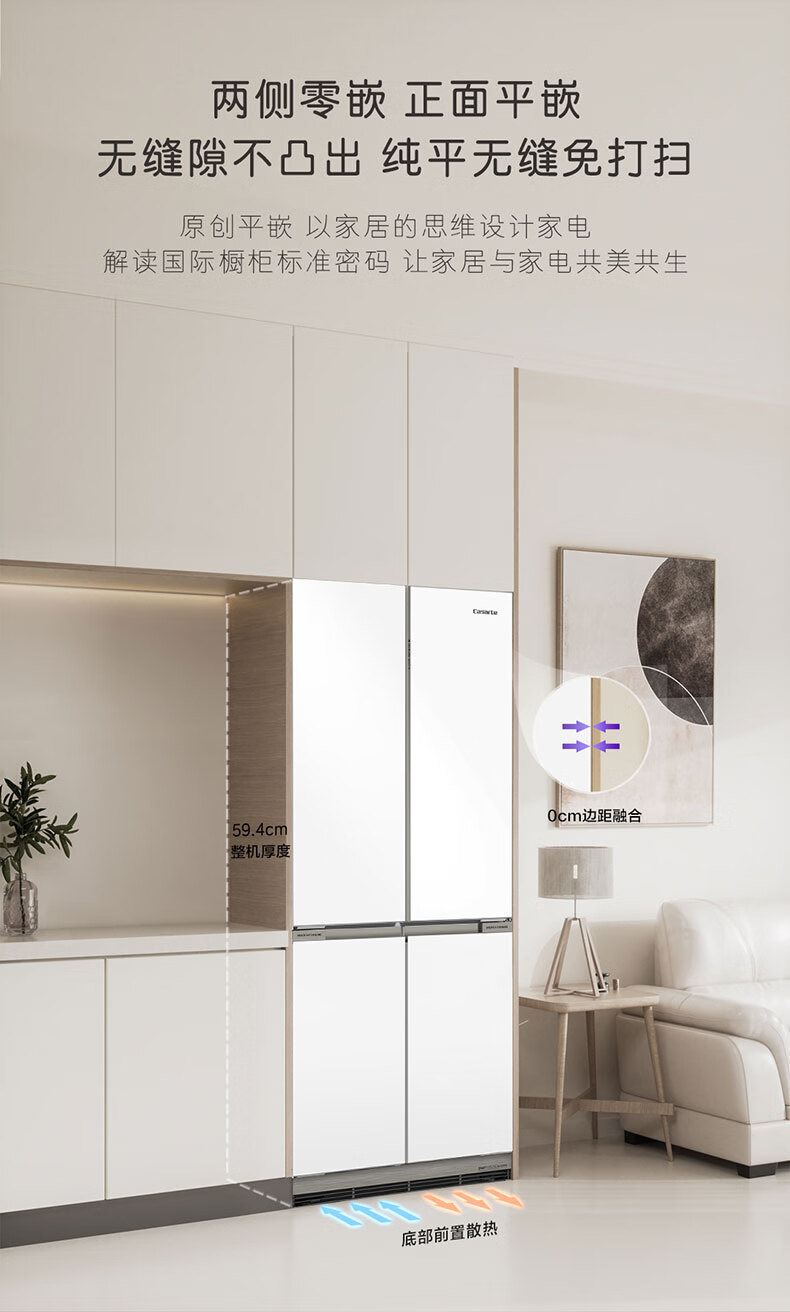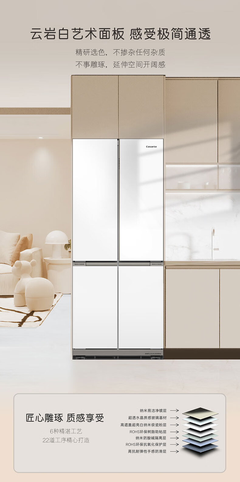 卡萨帝(Casarte)501升设计师系列原创平嵌十字对开四开门超薄嵌入式电冰箱一级能效家用双底置循环风幕 【云岩白】BCD-501WGCTDM4WKU1