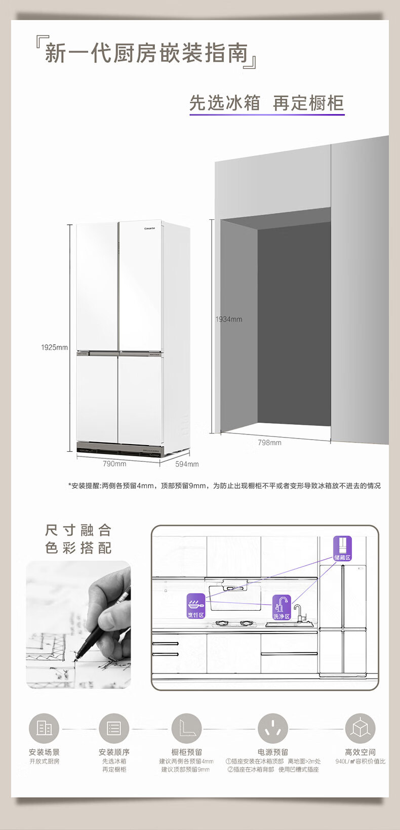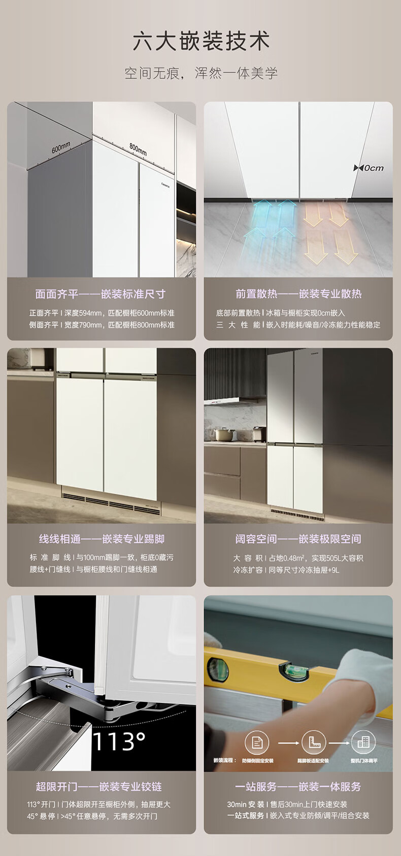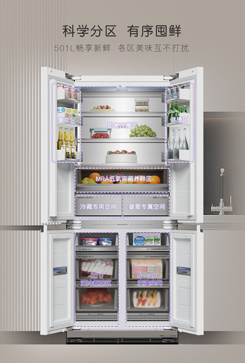 卡萨帝(Casarte)501升设计师系列原创平嵌十字对开四开门超薄嵌入式电冰箱一级能效家用双底置循环风幕 【云岩白】BCD-501WGCTDM4WKU1