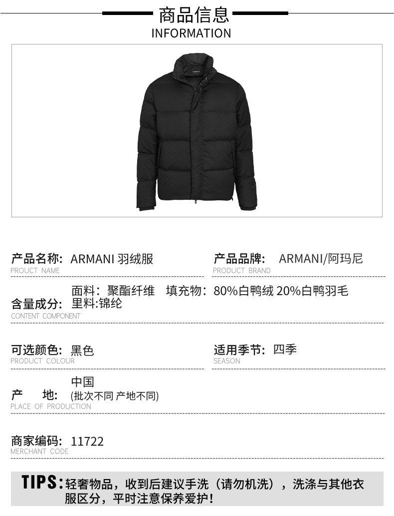 【超惠秒】Emporio Armani 男士刺绣小飞鹰logo抗寒保暖羽绒服 11722