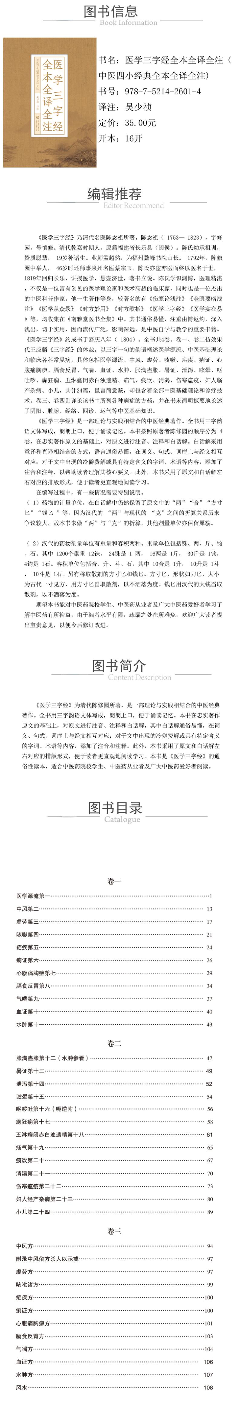 出版者的话 中医学是中国优秀文化的重要组成部分,传承发展中医药事业是适应时代发展要求的历史使命。中医古籍经典是中医药学发展的根基,中医临床则是其长久发展的核心力量。传承中医,要从读经典入手,文以载道,“自古医家出经典”,中医传统思维尽在于医籍,因此经典要读。 《汤头歌诀》《医学三字经》《药性歌括四百味》《濒湖脉学》并称为中医学四小经典著作,几千年来在中医界有着崇高的地位,是后世所有医书所不能取代的,备受历代医家重视,也是现今中医学者推荐阅读的经典著作。 由于经典著作成书较早,文字古奥,语句艰深,为了让现代读者更好地古为今用、理解其核心要义,我社组织出版了 “中医四小经典全本全译全注 ”丛书。本套丛书分为《汤头歌诀全本全译全注》《医学三字经全本全译全注》《药性歌括四百味全本全译全注》《濒湖脉学全本全译全注》 4个分册。各分册主要包括原文、白话解、注音、注释等内容。其中原文选择公认的善本为蓝本;白话解通俗易懂,在词义、句式、词序上与经文相互对应;对于文中出现的冷僻费解或具有特定含义的字词、术语等内容,进行了必要的注音和注释。此外,为方便读者诵读学习,特将本套丛书设计为原文和白话解左右对应的排版形式,行格舒朗,层次分明。 本次整理,力求原文准确,遴选精善底本,若底本与校本有文字存疑之处,择善而从。整理原则如下。 ( 1)全书采用简体横排,加用标点符号。底本中的繁体字、异体字径改为规范简体字,古字以今字律齐。凡古籍中所见 “右药”“右件”等字样中,“右”均改为 “上”。 ( 2)凡底本、校本中有明显的错字、讹字,经校勘无误后予以径改,不再出注。 ( 3)古籍中出现的中医专用名词术语规范为现通用名。如“藏府”改为“脏腑”,“旋复花”改为“旋覆花”等。