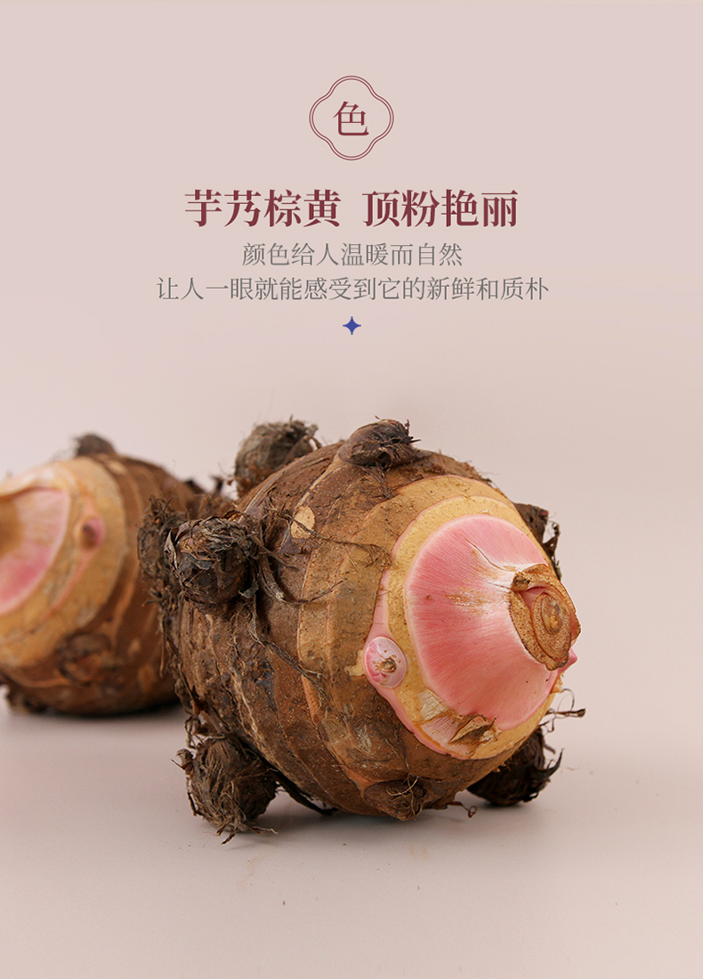 “走过三关六码头,吃过奉化芋艿头”,奉化芋艿头品种多样,包括红芋艿、乌脚箕、黄粉箕等。芋头姐档口中85%为红芋艿,芋头和芋子都好吃,顶端微红,皮薄肉厚,淀粉含量高,入口细腻并带有浓郁香气。