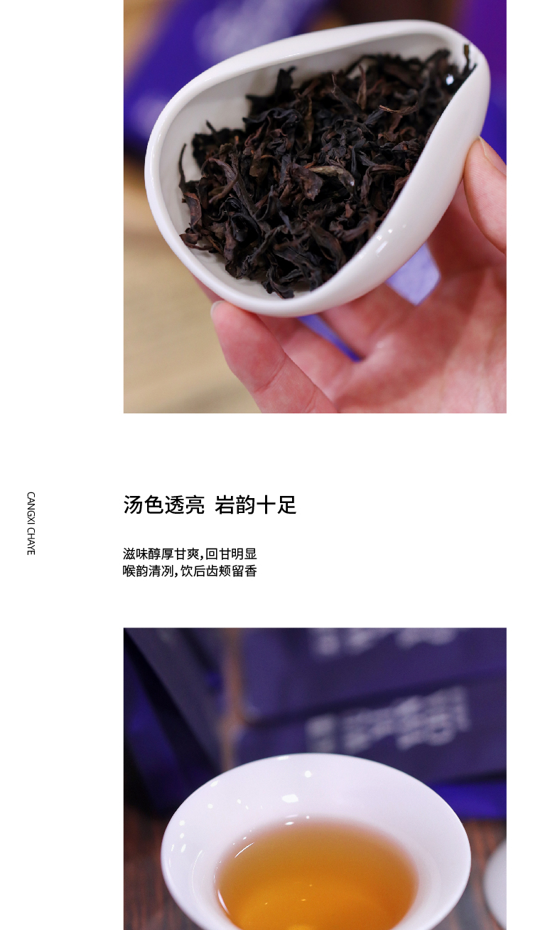 汤色透亮,岩韵十足,滋味醇厚甘爽,回甘明显,喉韵清冽,饭后齿颊留香;