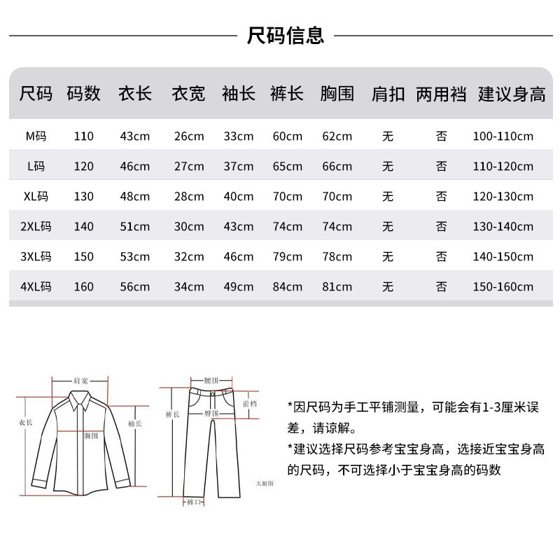 注意:小孩子的身形因为在发育中都不一样,建议根据平时穿的尺码拍大一码!