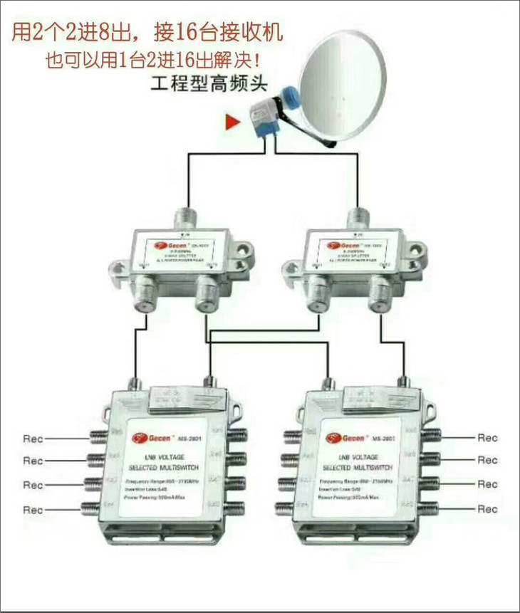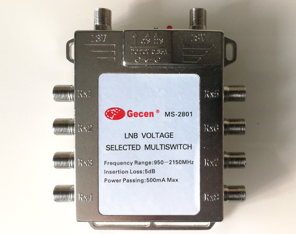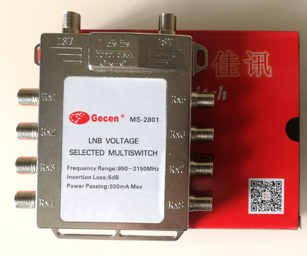 二进八出开关,可与二输出高频头配合带更多机顶盒。(支持电源放大信号,没有带电源适配器)