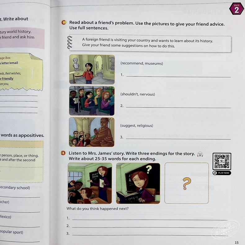 Activity Types:picture-based storytelling;picture description with subject prompts;emails;guided brainstorming;related information prompts to guide writing on a given topic;consolidation in the form of a writing quiz;description of a situation that requires writing suggestions or excuses for and against (the topic);analysing sample responses;articles & essays;students’ own experiences or opinions;reviews.