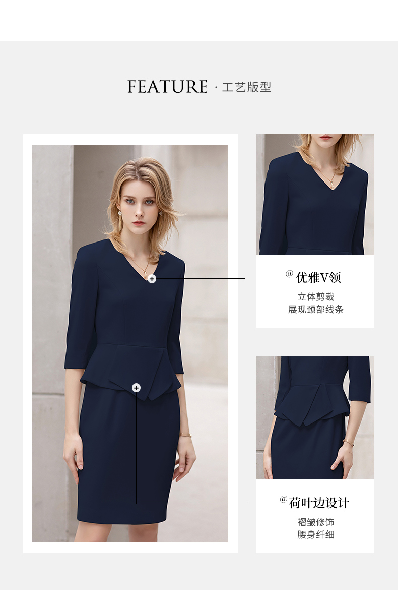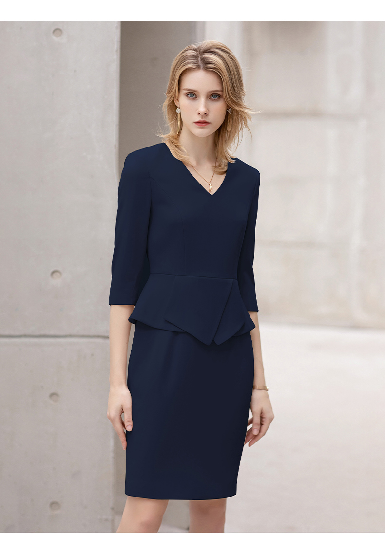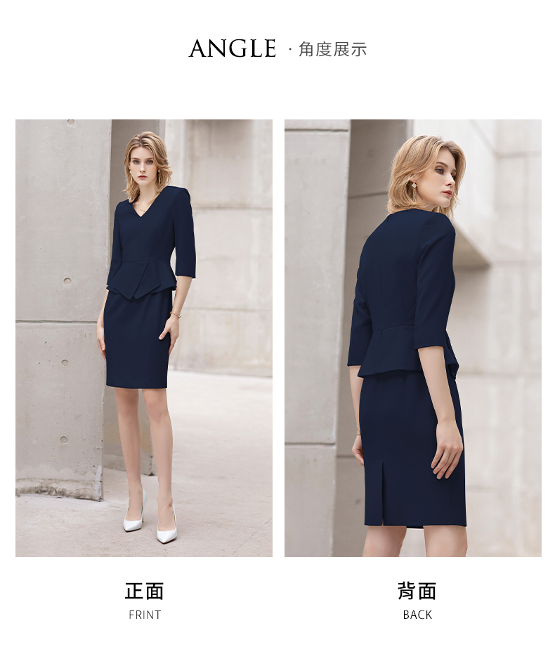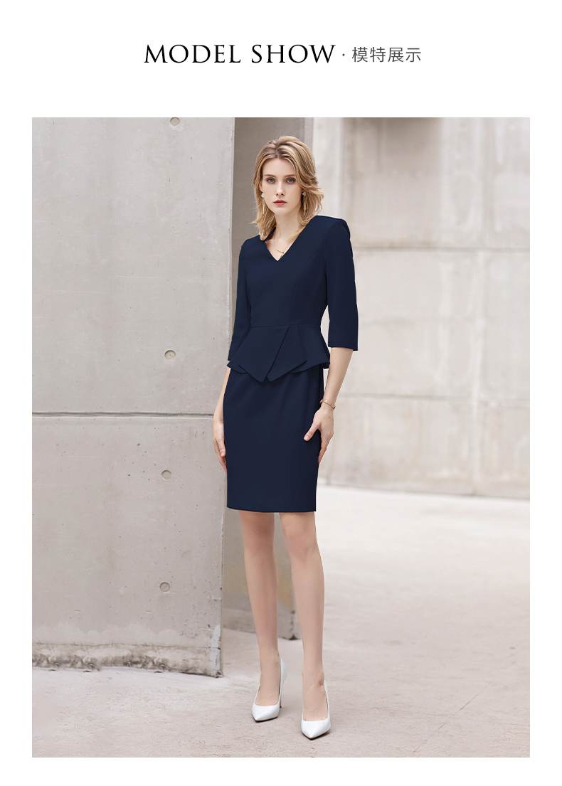 IWY/2022夏季薄款通勤假两件七分袖连衣裙女士修身包臀藏青色职业套裙