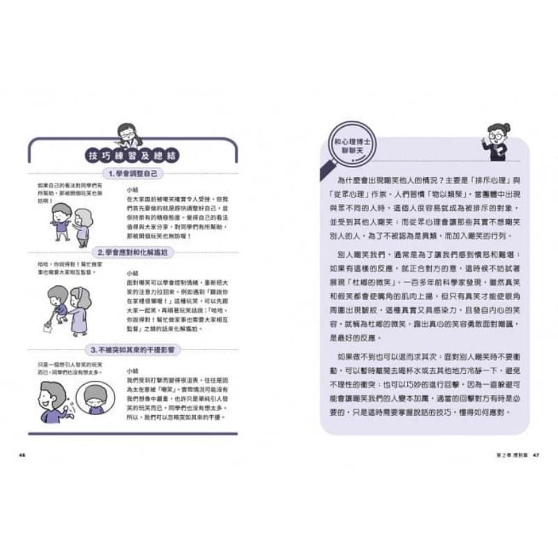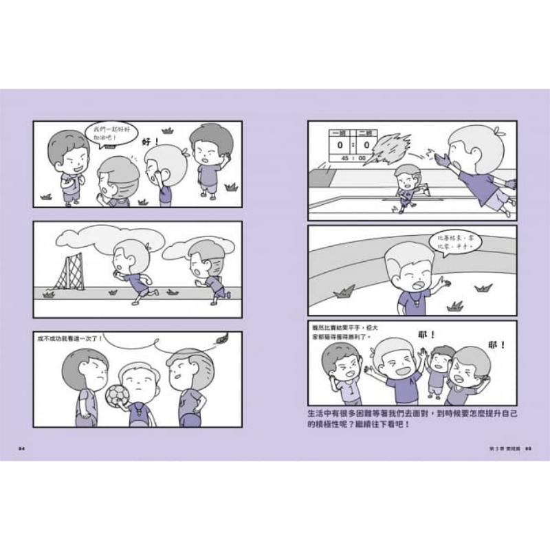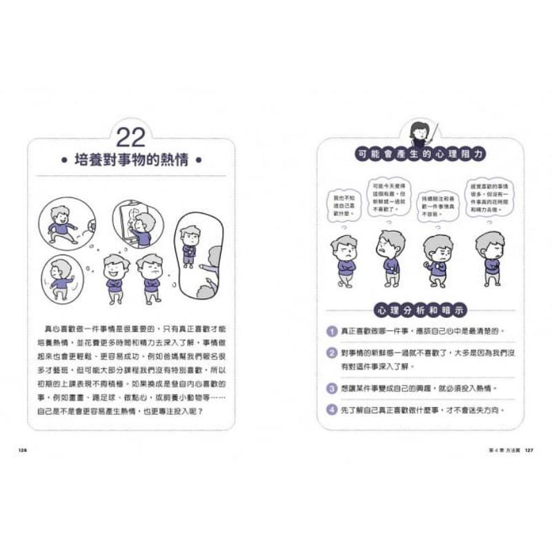 书中的核心内容是「学更多」、「做更多」,让孩子在学习与生活方面, 都能保持积极与主动。每一章开头从趣味漫画场景切入问题,使读者融入情境一同思考如何应对;每篇的实例练习,搭配插图辅助说明。井然有序的版面视觉动线,与浅显的语言,引导读者清楚理解内容,生动的插图映照出读者经常产生的内心戏。