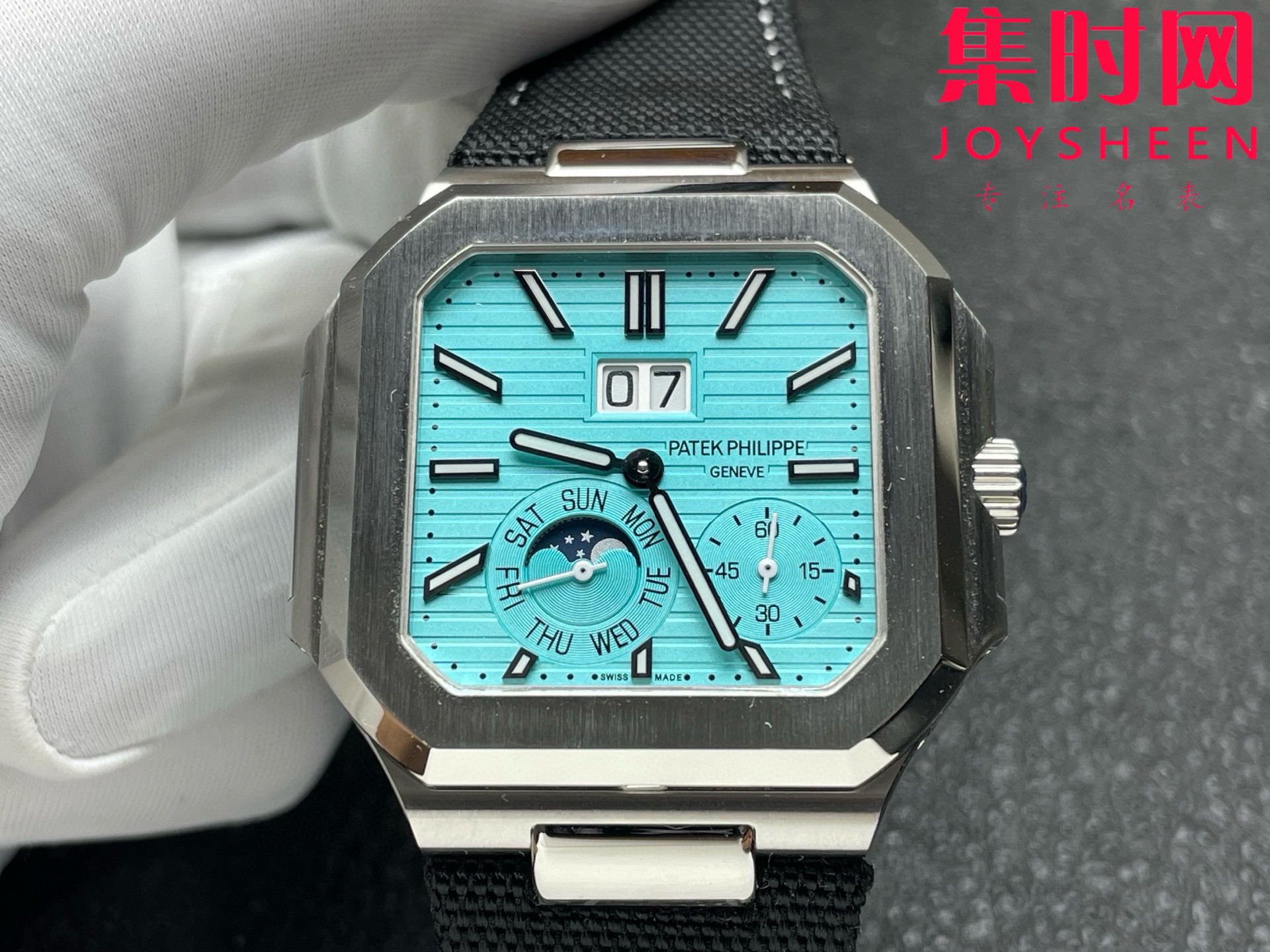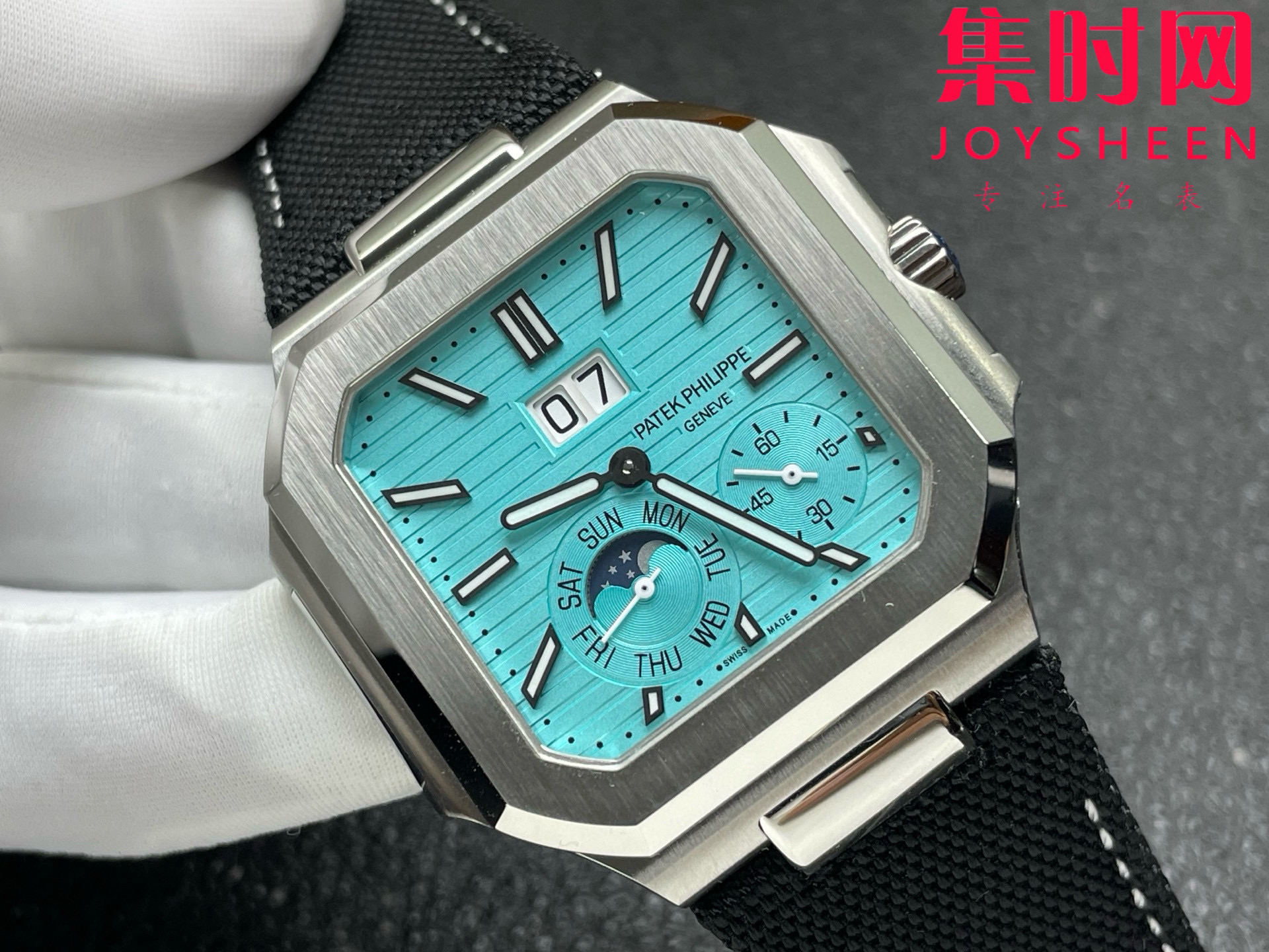 百达翡丽重磅推出新款 CUBITUS系列5822P-001 P1方形鹦鹉螺 蒂芙尼蓝 男士腕表 瞬跳大日历窗,星期及月相显示功能