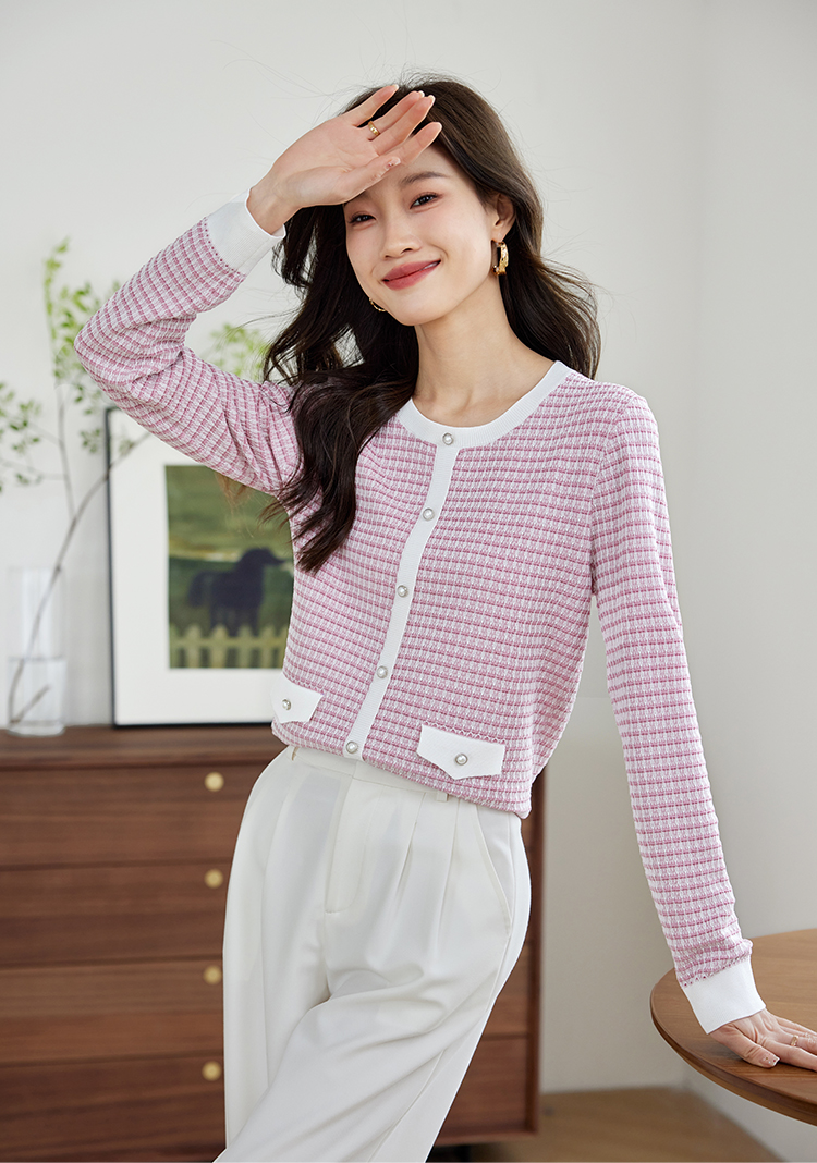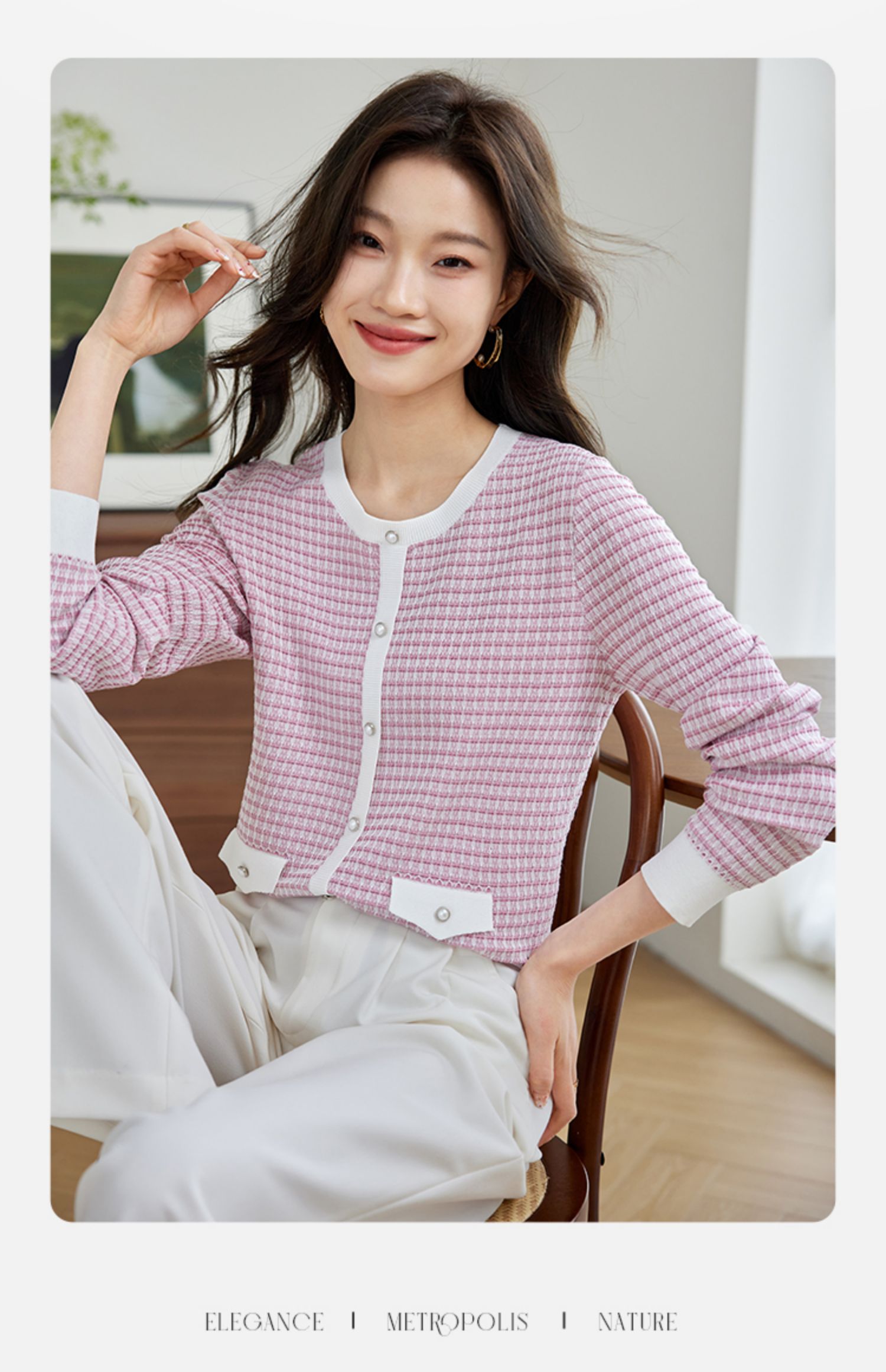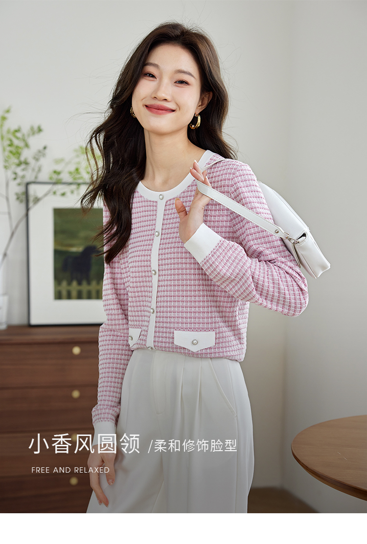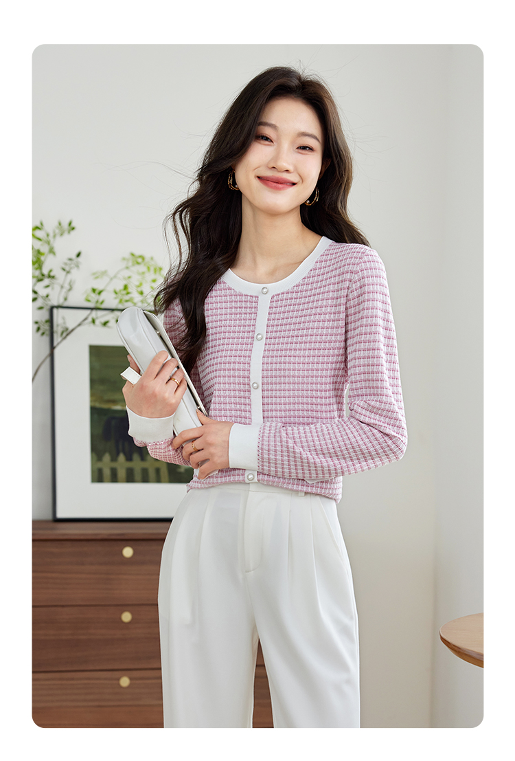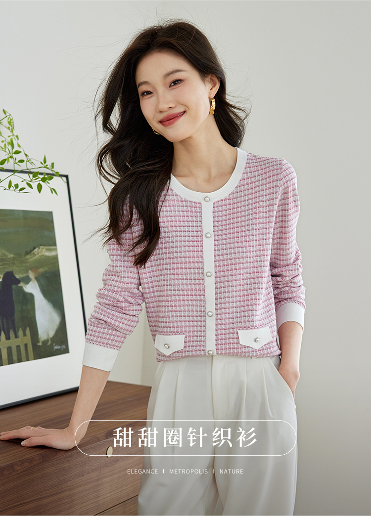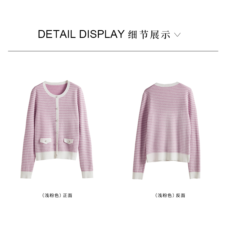 【专属特价】熙世界小香风撞色格子圆领针织衫长袖软糯提花上衣2025秋季新款