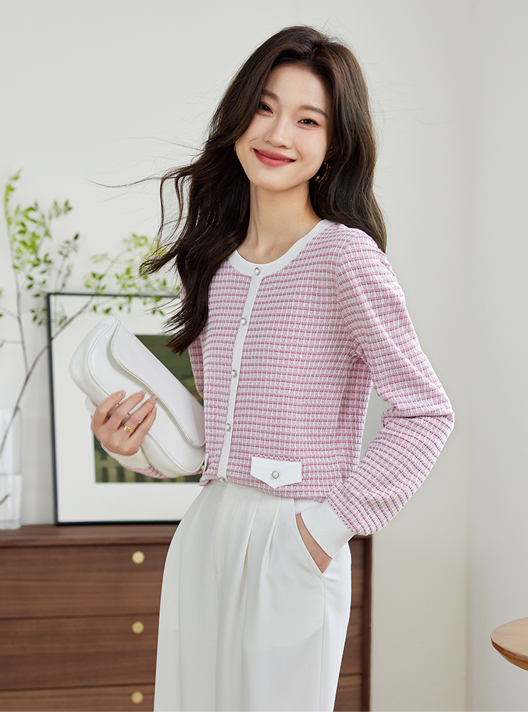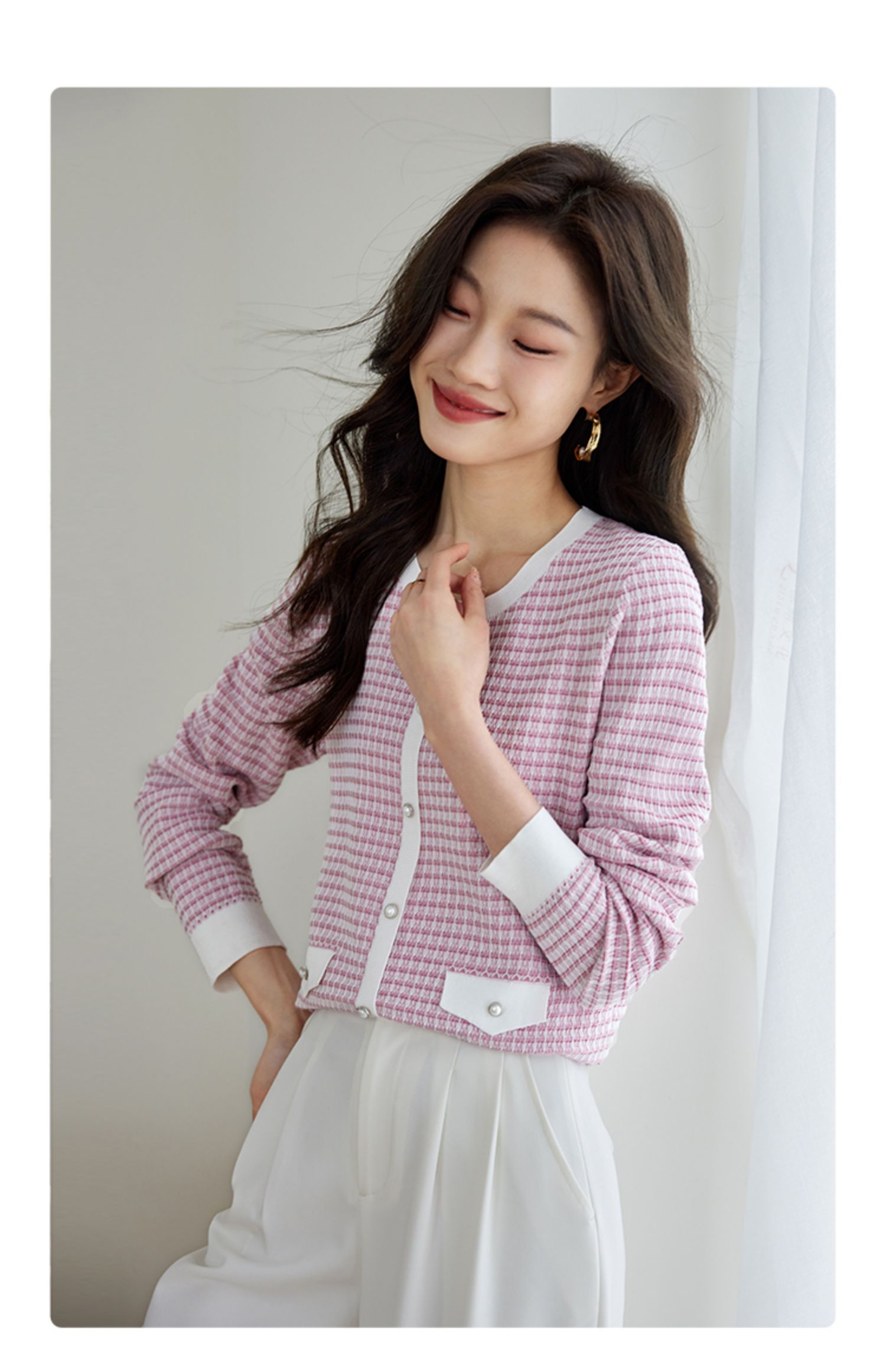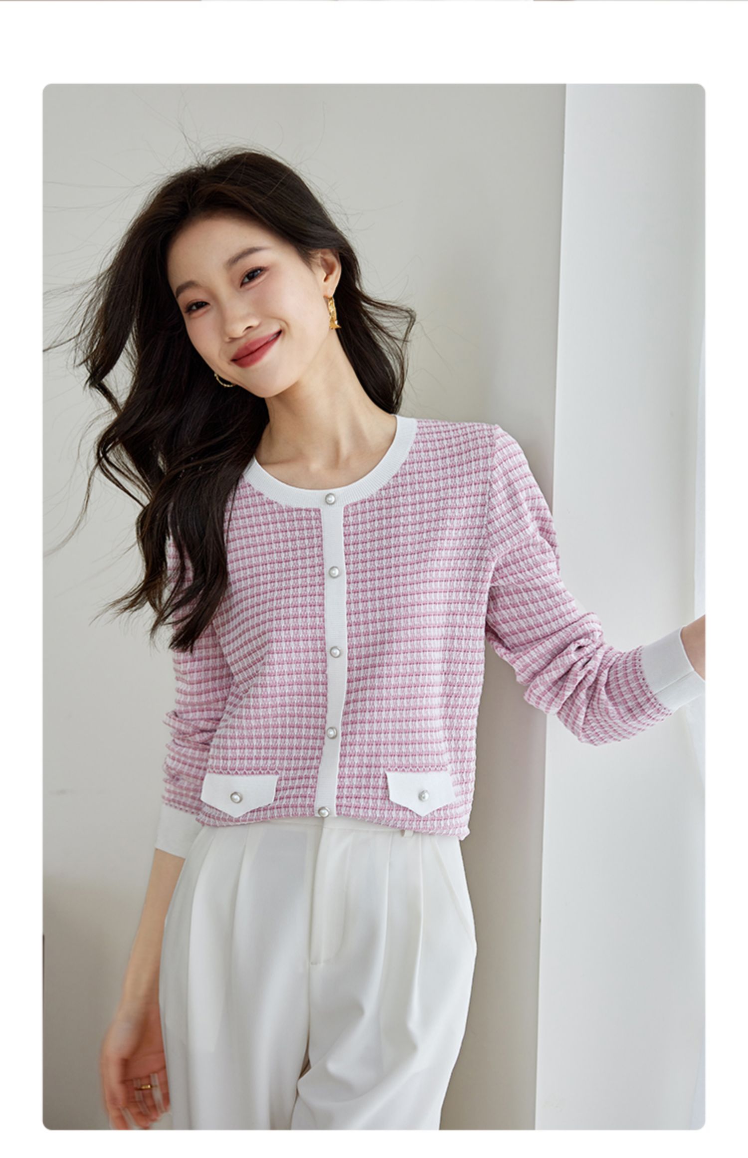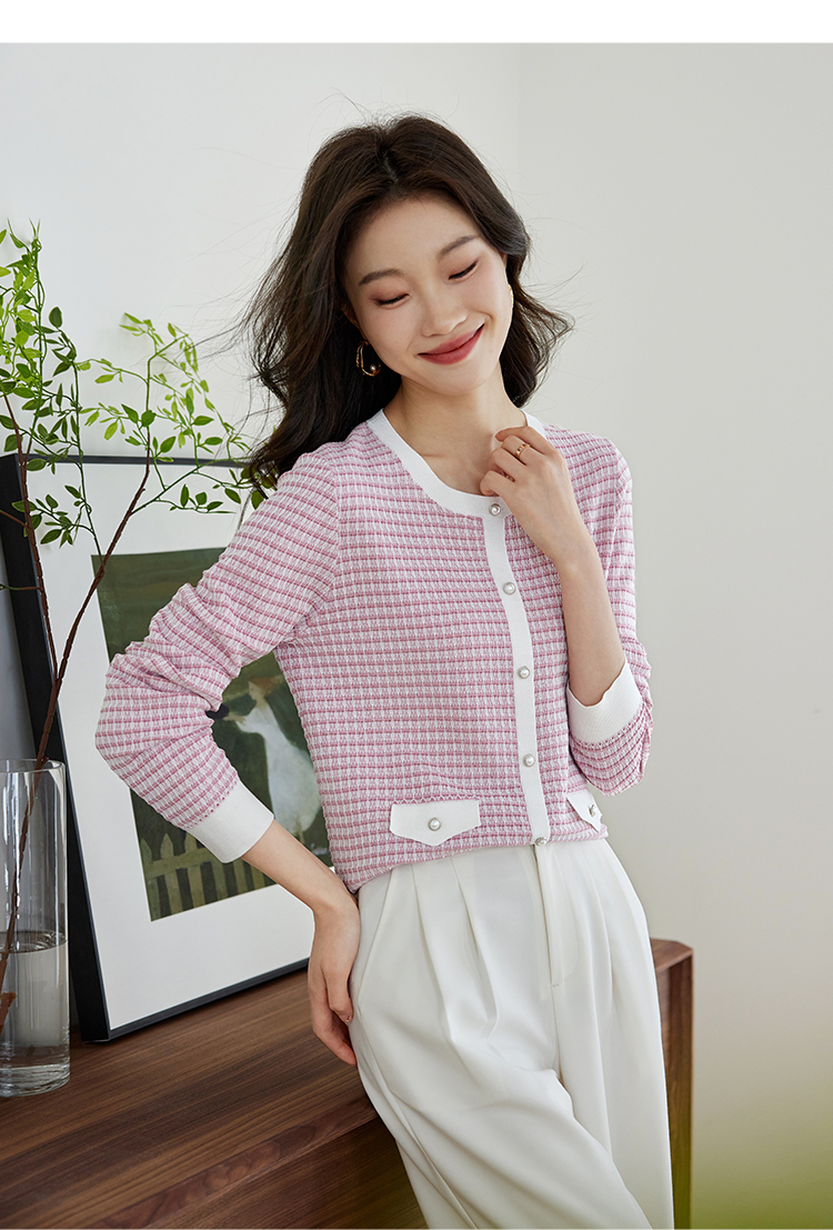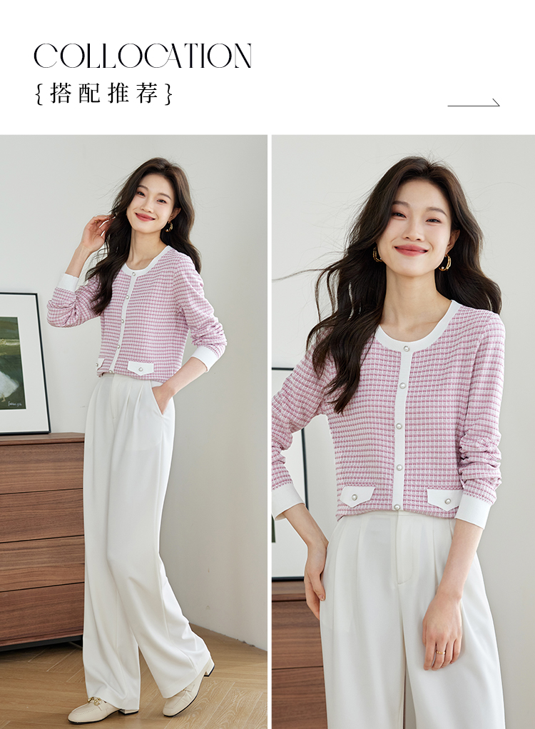 【专属特价】熙世界小香风撞色格子圆领针织衫长袖软糯提花上衣2025秋季新款