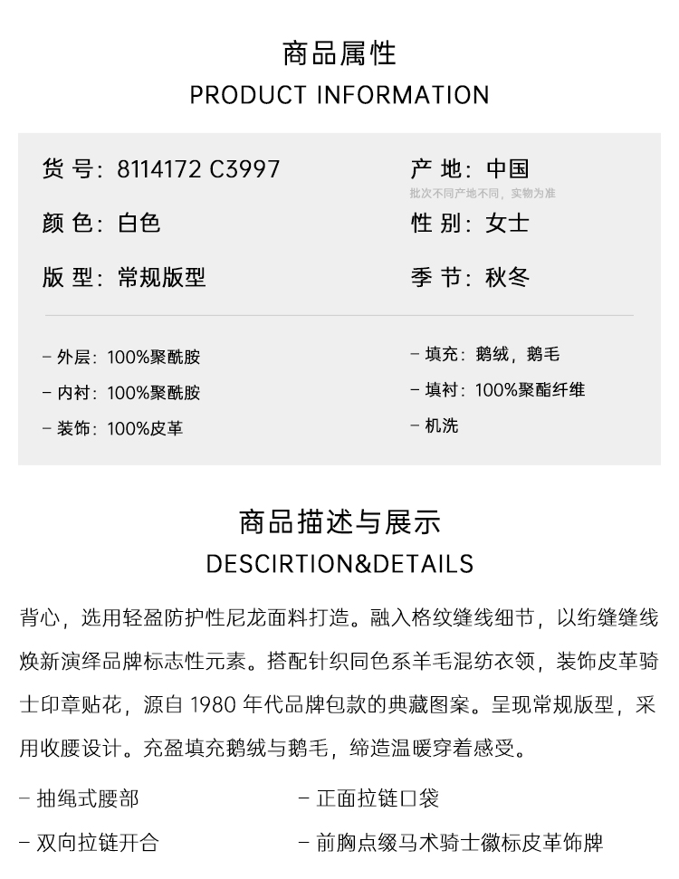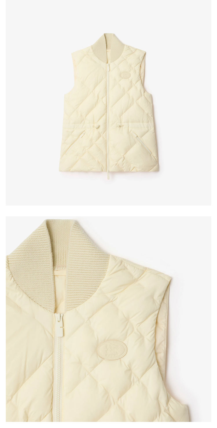 BURBERRY 巴宝莉 女士马术骑士徽标贴片格纹缝线羽绒马甲 白色 8114172 C3997